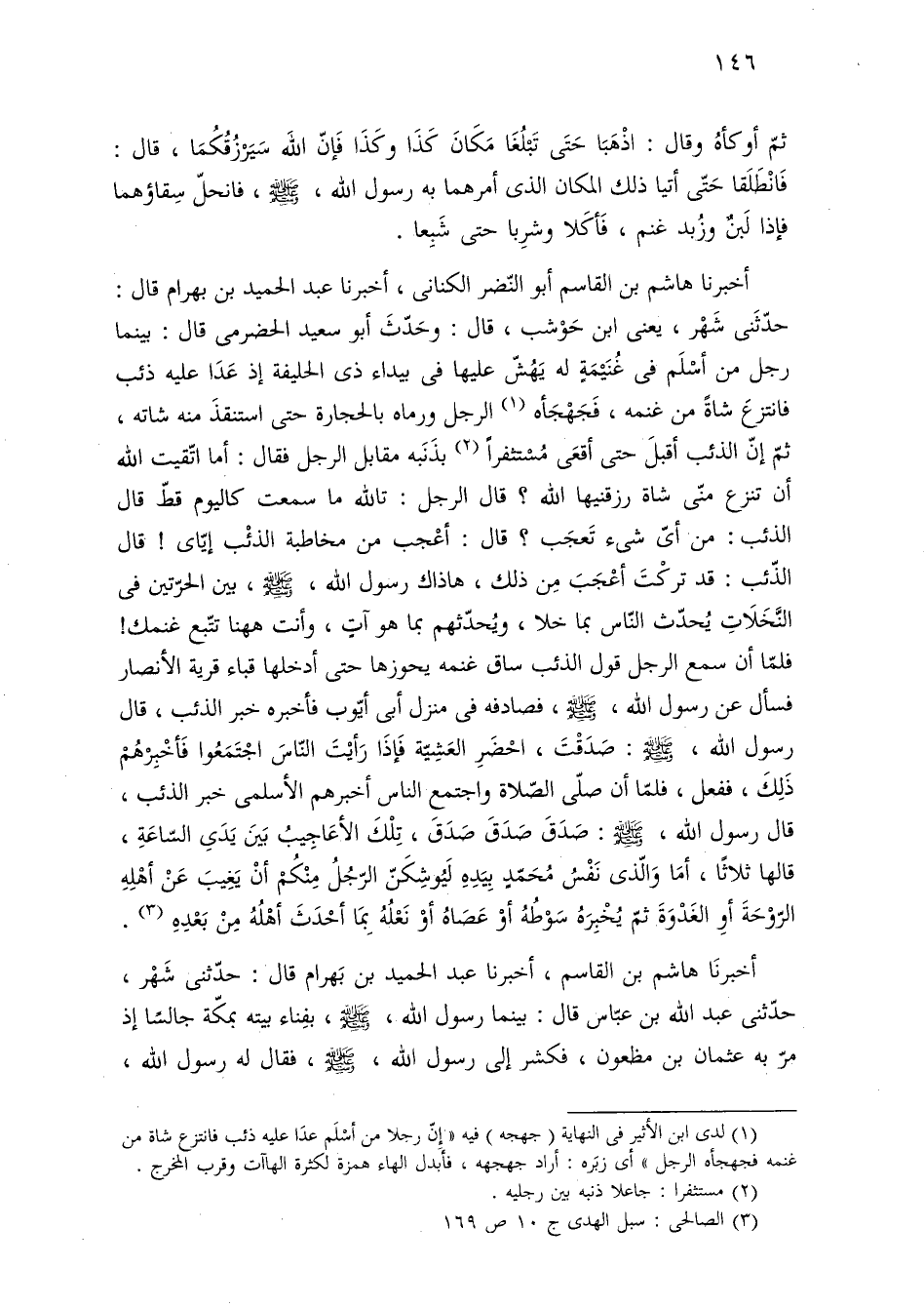 أخبرنا هاشم بن القاسم أبو النّضر الكنانى، أخبرنا عبد الحميد بن بهرام قال: حدّثَنى شَهْر، يعنى ابن حَوْشب، قال: وحَدّثَ أبو سعيد الحضرمى قال: بينما رجل من أسْلَم فى غُنَيْمَةٍ له يَهُشّ عليها فى بيداء ذى الحليفة إذ عَدَا عليه ذئب فانتزعَ شاةً من غنمه، فَجَهْجَأه (¬١) الرجل ورماه بالحجارة حتى استنقذَ منه شاته، ثمّ إنّ الذئب أقبلَ حتى أقعَى مُسْتثفرًا (¬٢) بذَنَبه مقابل الرجل فقال: أما اتّقيت اللَّه أن تنزع منّى شاة رزقنيها اللَّه؟ قال الرجل: تاللَّه ما سمعت كاليوم قطّ قال الذئب: من أىّ شئ تَعجَب؟ قال: أعْجب من مخاطبة الذئْب إيّاى! قال الذّئب: قد تركْتَ أعْجَبَ مِن ذلك، هاذاك رسول اللَّه، -صلى اللَّه عليه وسلم-، بين الحرّتين فى النَّخَلَاتِ يُحدّث النّاس بما خلا، ويُحدّثهم بما هو آتٍ، وأنت ههنا تتّبع غنمك! فلمّا أن سمع الرجل قول الذئب ساق غنمه يحوزها حتى أدخلها قباء قرية الأنصار فسأل عن رسول اللَّه، -صلى اللَّه عليه وسلم-، فصادفه فى منزل أبى أيّوب فأخبره خبر الذئب، قال رسول اللَّه، -صلى اللَّه عليه وسلم-: صَدَقْتَ، احْضَرِ العَشِيّة فَإذَا رَأيْتَ النّاسَ اجْتَمَعُوا فَأخْبِرْهُمْ ذَلِكَ، ففعل، فلمّا أن صلّى الصّلاة واجتمع الناس أخبرهم الأسلمى خبر الذئب، قال رسول اللَّه، -صلى اللَّه عليه وسلم-: صَدَقَ صَدَقَ صَدَقَ، تِلْكَ الأعَاجِيبُ بَينَ يَدَىِ السّاعَةِ، قالها ثلاثًا، أمَا وَالّذى نَفْسُ مُحَمّدٍ بِيَدِهِ ليُوشِكَنّ الرّجُلُ مِنْكُمْ أنْ يَغِيبَ عَنْ أهْلِهِ الرّوْحَةَ أوِ الغَدْوَةَ ثمّ يُخْبِرَهُ سَوْطُهُ أوْ عَصَاهُ أوْ نَعْلُهُ بِمَا أحْدَثَ أهْلُهُ مِنْ بَعْدِهِ (¬٣).
