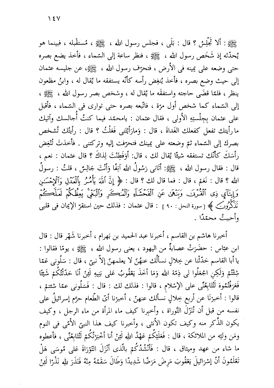 -صلى اللَّه عليه وسلم-: ألا تَجْلِسُ؟ قال: بَلَى، فجلس رسول اللَّه، -صلى اللَّه عليه وسلم-، مُستقْبله، فبينما هو يُحدّثه إذ شَخَص رسول اللَّه، -صلى اللَّه عليه وسلم-، فنظر ساعة إلى السّماء، فأخذ يضع بصره حتى وضعه على يمينه فى الأرض، فتحرّف رسول اللَّه، -صلى اللَّه عليه وسلم-، عن جليسه عثمان إلى حيث وضع بصره، فأخذ يُنغِض رأسه كأنّه يستفقه ما يُقال له، وابنُ مظعون ينظر، فلمّا قضَى حاجته واستفقَه ما يُقال له، وشخص بصر رسول اللَّه، -صلى اللَّه عليه وسلم-، إلى السّماء كما شخص أول مرّة، فاتّبعه بصره حتى توارى فى السّماء، فأقبل على عثمان بِجِلْستِهِ الأولى، فقال عثمان: يا محمّد فيما كنتُ أُجالسك وآتيك ما رأيتك تفعل كفعلك الغَداةَ، قال: وَما رَأيْتَنى فَعَلْتُ؟ قال: رأيتُك تُشخص بصرك إلى السّماء ثمّ وضعته على يمينك فتحرّفت إليه وتركتنى. فأخذتَ تُنْغِض رأسَكَ كانك تستفقه شيئًا يُقال لك، قال: أوَفَطِنْتَ لِذاكَ؟ قال عثمان: نعم، قال: فقال رسول اللَّه، -صلى اللَّه عليه وسلم-: أتَانى رَسُولُ اللَّه آنِفًا وَأنْتَ جَالسٌ، قلتُ: رسولُ اللَّه؟ قال: نَعَمْ، قال: فما قال لك؟ قال: {إِنَّ اللَّهَ يَأْمُرُ بِالْعَدْلِ وَالْإِحْسَانِ وَإِيتَاءِ ذِى الْقُرْبَى وَيَنْهَى عَنِ الْفَحْشَاءِ وَالْمُنْكَرِ وَالْبَغْيِ يَعِظُكُمْ لَعَلَّكُمْ تَذَكَّرُونَ} [سورة النحل: ٩٠]: قال عثمان: فذلك حين استقرّ الإيمان فى قلبى وأحببتُ محمّدًا.