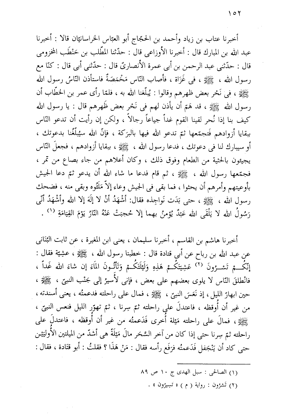 أخبرنا عتاب بن زياد وأحمد بن الحجّاج أبو العبّاس الخراسانيّان قال: أخبرنا عبد اللَّه بن المبارك قال: أخبرنا الأوزاعى قال: حدّثنا المطّلب بن حَنْطَب المخزومى قال: حدّثنى عبد الرحمن بن أبى عمرة الأنصارىّ قال: حدّثنى أبى قال: كنّا مع رسول اللَّه، -صلى اللَّه عليه وسلم-، فى غَزَاة، فأصاب النّاس مَخْمَصَةٌ فاستأذن النّاسُ رسول اللَّه -صلى اللَّه عليه وسلم-، فى نَحْر بعض ظهرهم وقالوا: يُبلّغنا اللَّه به، فلمّا رأى عمر بن الخطّاب أن رسول اللَّه -صلى اللَّه عليه وسلم-، قد هَمّ أن يأذن لهم فى نَحْر بعض ظَهرهم قال: يا رسول اللَّه كيف بنا إذا نُحر لقينا القوم غدًا جياعًا رجالًا، ولكن إن رأيت أن تدعو النّاس ببقايا أزوادهم فَتجمّعها ثمّ تدعو اللَّه فيها بالبرَكة، فإنّ اللَّه سيُبلّغُنا بدعوتك، أو سيبارك لنا فى دعوتك، فدعا رسول اللَّه، -صلى اللَّه عليه وسلم-، ببقايا أزوادهم، فجعلَ النّاس يجيئون بالحثية من الطعام وفوق ذلك، وكان أعلاهم من جاء بصاع من تمر، فجمّعها رسول اللَّه، -صلى اللَّه عليه وسلم-، ثم قام فدعا ما شاء اللَّه أن يدعو ثمّ دعا الجيش بأوعيتهم وأمرهم أن يحثوا، فما بقى فى الجيش وعاء إلّا مَلَئُوه وبقى منه، فضحك رسول اللَّه، -صلى اللَّه عليه وسلم-، حتى بَدَت نَواجِذه فقال: أشْهَدُ أنْ لا إلَهَ إلا اللَّه وأشْهَدُ أنّى رَسُولُ اللَّه لا يَلْقَى اللَّه عَبْدٌ يُؤمنُ بهما إلا حُجبَتْ عَنْهُ النّارُ يَوْمَ القِيَامَةِ (¬١).
