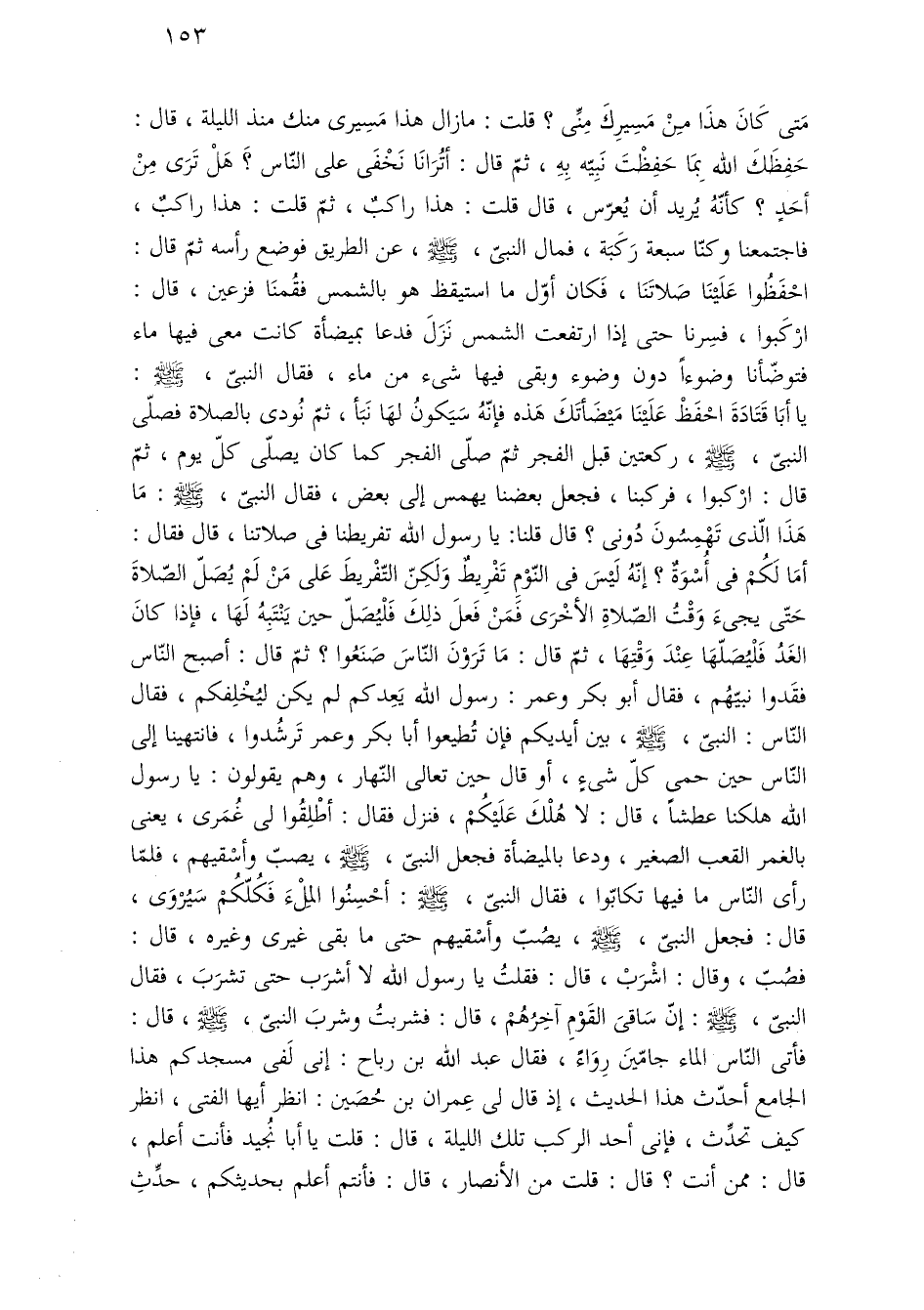 مَتى كَانَ هذَا مِنْ مَسِيرِكَ مِنِّى؟ قلت: ما زال هذا مَسِيرى منك منذ الليلة، قال: حَفِطَثَ اللَّه بِمَا حَفِظْتَ نَبِيّه بِهِ، ثمّ قال: أتُرَانَا نَخْفَى على النّاس؟ هَلْ تَرَى مِنْ أحَدٍ؟ كأنّهُ ئريد أن يُعرّس، قال قلت: هذا راكبٌ، ثمّ قلت: هذا راكبٌ، فاجتمعنا وكنّا سبعة رَكَبَة، فمال النبىّ، -صلى اللَّه عليه وسلم-، عن الطريق فوضع رأسه ثمّ قال: احْفَظوا عَلَيْنَا صَلاتَنَا، فَكان أوّل ما استيقظ هو بالشمس فقُمنَا فزعين، قال: ارْكَبوا، فسِرنا حتى إذا ارتفعت الشمس نَزَلَ فدعا بميضأة كانت معى فيها ماء فتوضّأنا وضوءًا دون وضوء وبقى فيها شئ من ماء، فقال النبىّ، -صلى اللَّه عليه وسلم-: يا أبَا قَتَادَةَ احْفَظْ عَلَيْنَا مَيْضَأتَكَ هَذه فإنّهُ سَيَكونُ لهَا نَبَأ، ثمّ نُودى بالصلاة فصلّى النبىّ، -صلى اللَّه عليه وسلم-، ركعتين قبل الفجر ثمّ صلّى الفجر كما كان يصلّى كلّ يوم، ثمّ قال: ارْكبوا، فركبنا، فجعل بعضنا يهمس إلى بعض، فقال النبىّ، -صلى اللَّه عليه وسلم-: مَا هَذَا الّذى تَهْمِسُونَ دُونى؟ قال قلنا: يا رسول اللَّه تفريطنا فى صلاتنا، قال فقال: أمَا لَكُمْ فى أُسْوَةٌ؟ إنّهُ لَيْسَ فى النّوْمٍ تَفْرِيطٌ وَلَكِنّ التّفْريطَ عَلى مَنْ لَمْ يُصَلّ الصّلاةَ حَتّى يجئَ وَقْت الصّلاةِ الأخْرَى فمَنْ فَعلَ ذلِكَ فَلْيُصَلّ حين يَنْتَبِهُ لَهَا، فإذا كانَ الغَدُ فَلْيُصَلّهَا عِنْدَ وَقْتِهَا، ثمّ قال: مَا تَرَوْنَ النّاسَ صَنَعُوا؟ ثمّ قال: أصبح النّاس فقَدوا نبيّهُم، فقال أبو بكر وعمر: رسول اللَّه يَعِدكم لم يكن ليُخْلِفكم، فقال النّاس: النبىّ، -صلى اللَّه عليه وسلم-، بين أيديكم فإن تُطيعوا أبا بكر وعمر تَرشُدوا، فانتهينا إلى النّاس حين حمى كلّ شئٍ، أو قال حين تعالى النّهار، وهم يقولون: يا رسول اللَّه هلكنا عطشًا، قال: لا هُلْكَ عَلَيْكُمْ، فنزل فقال: أطْلِقُوا لى غُمَرى، يعنى بالغمر القعب الصغير، ودعا بالميضأة فجعل النبىّ، -صلى اللَّه عليه وسلم-، يصبّ وأسْقيهم، فلمّا رأى النّاس ما فيها تكابّوا، فقال النبىّ، -صلى اللَّه عليه وسلم-: أحْسِنُوا المِلْءَ فَكُلّكُمْ سَيُرْوَى، قال: فجعل النبىّ، -صلى اللَّه عليه وسلم-، يصُبّ وأسْقيهم حتى ما بقى غيرى وغيره، قال: فصُبّ، وقال: اشْرَبْ، قال: فقلتُ يا رسول اللَّه لا أشرَب حتى تشرَبَ، فقال النبىّ، -صلى اللَّه عليه وسلم-: إنّ سَاقىَ القَوْمِ آخِرُهُمْ، قال: فشربتُ وشربَ النبىّ، -صلى اللَّه عليه وسلم-، قال: فأتى النّاس الماء جامّينَ رِوَاءً، فقال عبد اللَّه بن رباح: إنى لَفى مسجدكم هذا الجامع أحدّث هذا الحديث، إذ قال لى عِمران بن حُصَين: انظر أيها الفتى، انظر كيف تحدِّث، فإنى أحد الركب تلك الليلة، قال: قلت يا أبا نُجيد فأنت أعلم، قال: ممن أنت؟ قال: قلت من الأنصار، قال: فأنتم أعلم بحديثكم، حدِّثِ