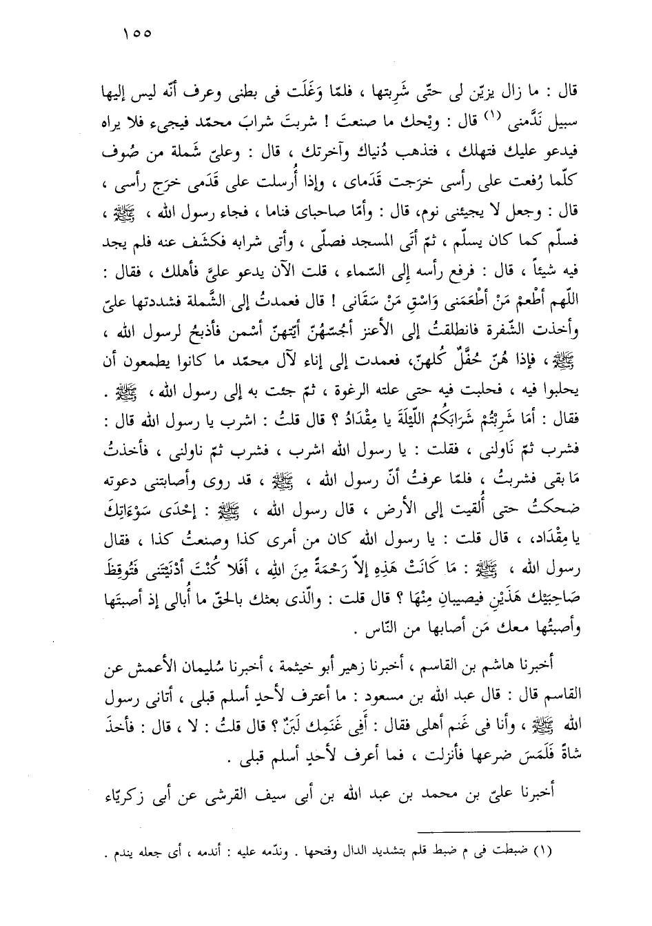 أخبرنا هاشم بن القاسم، أخبرنا زهير أبو خيثمة، أخبرنا سُليمان الأعمش عن القاسم قال: قال عبد اللَّه بن مسعود: ما أعترف لأحدٍ أسلم قبلى، أتانى رسول اللَّه -صلى اللَّه عليه وسلم-، وأنا فى غَنم أهلى فقال: أَفِى غَنَمِك لَبَنٌ؟ قال قلتُ: لا، قال: فأخذَ شاةً فَلَمَسَ ضرعها فأنزلت، فما أعرف لأحدٍ أسلم قبلى.
