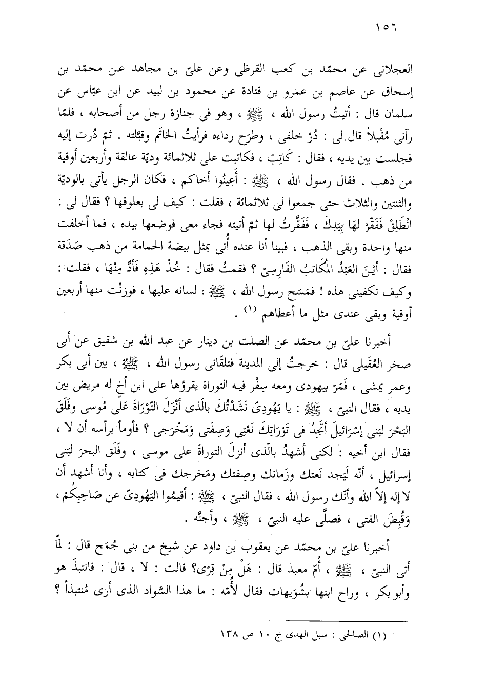 العجلانى عن محمّد بن كعب القرظى وعن علىّ بن مجاهد عن محمّد بن إسحاق عن عاصم بن عمرو بن قتادة عن محمود بن لبيد عن ابن عبّاس عن سلمان قال: أتيتُ رسول اللَّه، -صلى اللَّه عليه وسلم-، وهو فى جنازة رجل من أصحابه، فلمّا رآنى مُقْبلًا قال لى: دُرْ خلفى، وطرَح رداءه فرأيتُ الخاتَم وقبَّلته. ثمّ دُرت إليه فجلست بين يديه، فقال: كَاتِبْ، فكاتبت على ثلاثمائة وديّة عالقة وأربعين أوقية من ذهب. فقال رسول اللَّه، -صلى اللَّه عليه وسلم-: أَعِينُوا أخاكم، فكان الرجل يأتى بالوديّة والثنتين والثلاث حتى جمعوا لى ثلاثمائة، فقلت: كيف لى بعلوقها؟ فقال لى: انْطَلِقْ فَفَقّرْ لهَا بِيَدِكَ، فَفَقَّرتُ لها ثمّ أتيته فجاء معى فوضعها بيده، فما أخلفت منها واحدة وبقى الذهب، فبينا أنا عنده أُتى بمثل بيضة الحمامة من ذهب صَدَقة فقال: أيْنَ العَبْدُ المُكَاتبُ الفَارِسِىّ؟ فقمتُ فقال: خُذْ هَذِهِ فَأدِّ مِنْهَا، فقلت: وكيف تكفينى هذه! فمَسَح رسول اللَّه، -صلى اللَّه عليه وسلم-، لسانه عليها، فوزنْت منها أربعين أوقية وبقى عندى مثل ما أعطاهم (¬١).