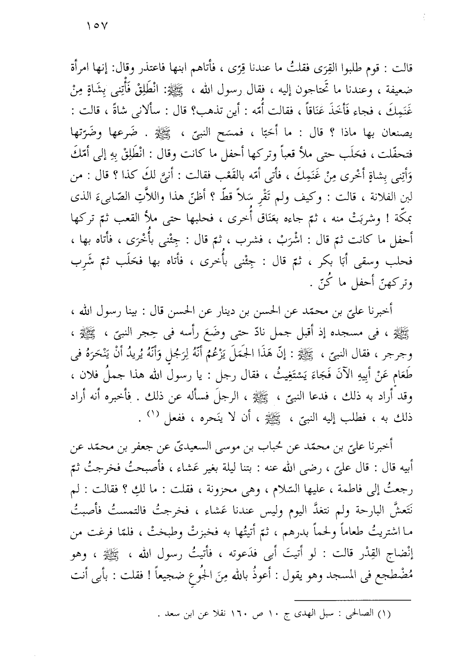 أخبرنا علىّ بن محمّد عن حُباب بن موسى السعيدىّ عن جعفر بن محمّد عن أبيه قال: قال علىّ، رضى اللَّه عنه: بتنا ليلة بغير عَشاء، فأصبحتُ فخرجتُ ثمّ رجعتُ إلى فاطمة، عليها السّلام، وهى محزونة، فقلت: ما لكِ؟ فقالت: لم نَتَعشَّ البارحة ولم نتغدَّ اليوم وليس عندنا عَشاء، فخرجتُ فالتمستُ فأصبتُ ما اشتريتُ طعامًا ولحمًا بدرهم، ثمّ أتيتُها به فخبزتْ وطبختْ، فلمّا فرغت من إنْضاج القِدْر قالت: لو أتيتَ أبى فدَعوته، فأتيتُ رسول اللَّه، -صلى اللَّه عليه وسلم-، وهو مُضْطجع فى المسجد وهو يقول: أعوذُ باللَّه مِنَ الجُوعِ ضجيعًا! فقلت: بأبى أنت