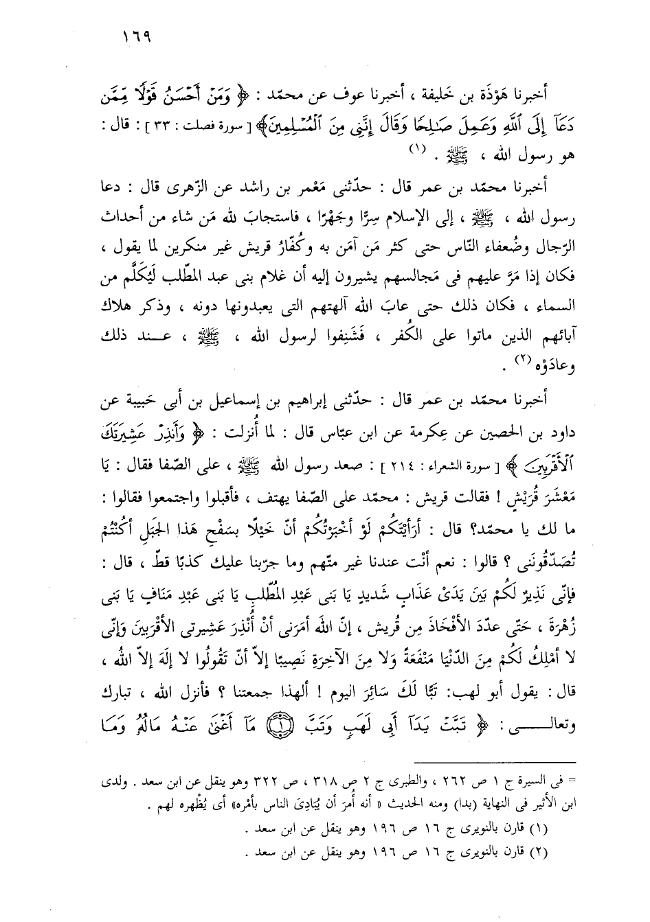أخبرنا محمّد بن عمر قال: حدّثنى إبراهيم بن إسماعيل بن أبى حَبيبة عن داود بن الحصين عن عِكرمة عن ابن عبّاس قال: لما أُنزلت: {وَأَنْذِرْ عَشِيرَتَكَ الْأَقْرَبِينَ} [سورة الشعراء: ٢١٤]: صعد رسول اللَّه -صلى اللَّه عليه وسلم-، على الصّفا فقال: يَا مَعْشَرَ قُرَيشٍ! فقالت قريش: محمّد على الصّفا يهتف، فأقبلوا واجتمعوا فقالوا: ما لك يا محمّد؟ قال: أرَأيْتَكُمْ لَوْ أخْبَرْتُكُمْ أنّ خَيْلًا بسَفْحِ هَذا الجَبَلِ أكُنْتُمْ تصَدّقُونَنى؟ قالوا: نعم أنْت عندنا غير متّهم وما جرّبنا عليك كذبًا قطّ، قال: فإنّى نَذِيرٌ لَكُمْ بَينَ يَدَىْ عَذَابٍ شَديدٍ يَا بَنى عَبْدِ المُطّلبِ يَا بَنى عَبْدِ مَنَافٍ يَا بَنى زُهْرَةَ، حَتّى عدّدَ الأفْخَاذَ مِن قُريش، إنّ اللَّه أمَرَنى أنْ أُنْذِرَ عَشِيرتى الأقْرَبِينَ وَإنّى لا أمْلِكُ لَكُمْ مِنَ الدّنْيَا مَنْفَعَةً وَلا مِنَ الآخِرَةِ نَصِيبًا إلّا أنّ تَقُولُوا لا إلَهَ إلّا اللَّهُ، قال: يقول أبو لهب: تَبًّا لَكَ سَائِرَ اليوم! ألهذا جمعتنا؟ فأنزل اللَّه، تبارك وتعالى: {تَبَّتْ يَدَا أَبِى لَهَبٍ وَتَبَّ (١) مَا أَغْنَى عَنْهُ مَالُهُ وَمَا