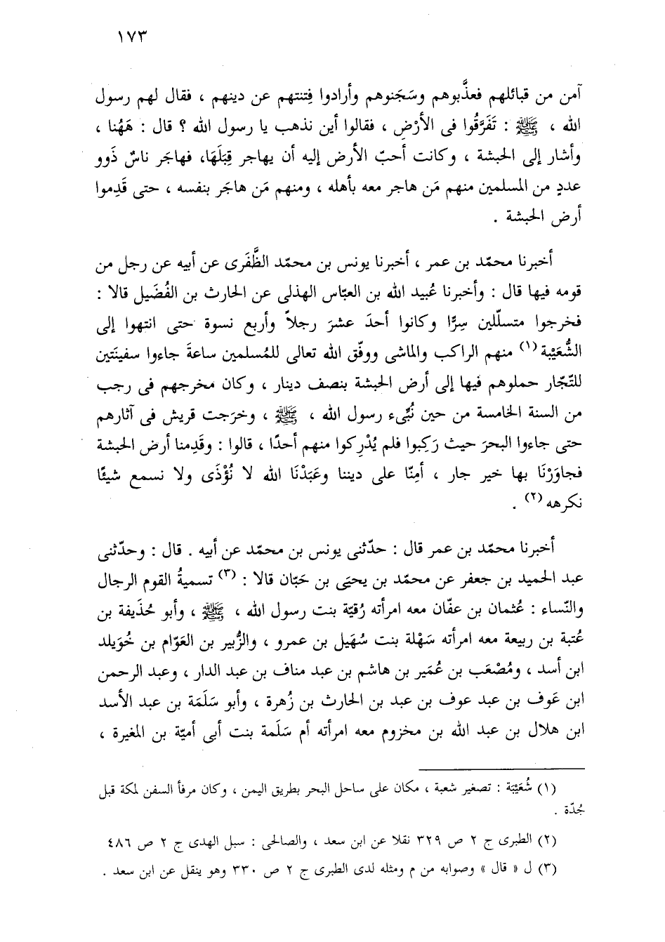 أخبرنا محمّد بن عمر، أخبرنا يونس بن محمّد الظَّفَرى عن أبيه عن رجل من قومه فيها قال: وأخبرنا عُبيد اللَّه بن العبّاس الهذلى عن الحارث بن الفُضَيل قالا: فخرجوا متسلّلين سِرًّا وكانوا أحدَ عشرَ رجلًا وأربع نسوة حتى انتهوا إلى الشُّعَيْبة (¬١) منهم الراكب والماشى ووفّق اللَّه تعالى للمُسلمين ساعةَ جاءوا سفينَتين للتّجّار حملوهم قيها إلى أرض الحبشة بنصف دينار، وكان مخرجهم فى رجب من السنة الخامسة من حين نُبِّئ رسول اللَّه، -صلى اللَّه عليه وسلم-، وخرَجت قريش فى آثارهم حتى جاءوا البحرَ حيث رَكِبوا فلم يُدْرِكوا منهم أحدًا، قالوا: وقَدِمنا أرض الحبشة فجاوَرْنَا بها خير جار، أمِنّا على ديننا وعَبَدْنَا اللَّه لا نُؤْذَى ولا نسمع شيئًا نكرهه (¬٢).