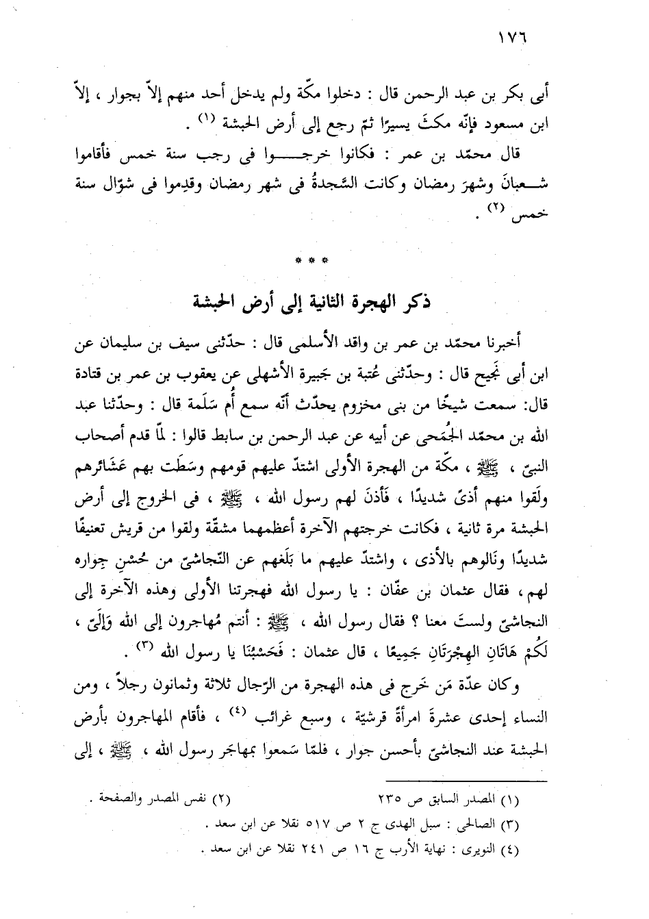 أخبرنا محمّد بن عمر بن واقد الأسلمى قال: حدّثنى سيف بن سليمان عن ابن أبى نَجيح قال: وحدّثنى عُتبة بن جَبيرة الأشهلى عن يعقوب بن عمر بن قتادة قال: سمعت شيخًا من بنى مخزوم يحدّث أنّه سمع أُم سَلَمة قال: وحدّثنا عبد اللَّه بن محمّد الجُمَحى عن أبيه عن عبد الرحمن بن سابط قالوا: لمّا قدم أصحاب النبىّ، -صلى اللَّه عليه وسلم-، مكّة من الهجرة الأولى اشتدّ عليهم قومهم وسَطَت بهم عَشَائرهم ولَقوا منهم أذًى شديدًا، فَأذنَ لهم رسول اللَّه، -صلى اللَّه عليه وسلم-، فى الخروج إلى أرض الحبشة مرة ثانية، فكانت خرجتهم الآخرة أعظمهما مشقّة ولقوا من قريش تعنيفًا شديدًا ونَالوهم بالأذى، واشتدّ عليهم ما بَلَغهم عن النّجاشىّ من حُسْنِ جِواره لهم، فقال عثمان بن عفّان: يا رسول اللَّه فهجرتنا الأولى وهذه الآخرة إلى النجاشىّ ولستَ معنا؟ فقال رسول اللَّه، -صلى اللَّه عليه وسلم-: أنتم مُهاجرون إلى اللَّه وَإلَىّ، لكُمْ هَاتَانِ الهِجْرَتَانِ جَمِيعًا، قال عثمان: فَحَسْبُنَا يا رسول اللَّه (¬٣).