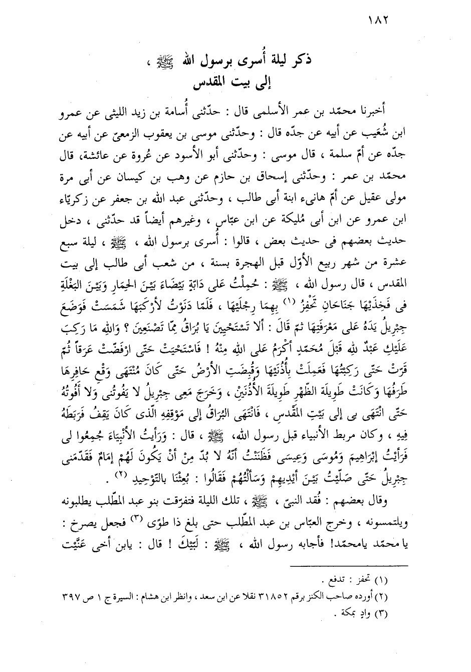 أخبرنا محمّد بن عمر الأسلمى قال: حدّثنى أُسامة بن زيد الليثى عن عمرو ابن شُعَيب عن أبيه عن جدّه قال: وحدّثنى موسى بن يعقوب الزمعىّ عن أبيه عن جدّه عن أمّ سلمة، قال موسى: وحدّثنى أبو الأسود عن عُروة عن عائشة، قال محمّد بن عمر: وحدّثنى إسحاق بن حازم عن وهب بن كيسان عن أبى مرة مولى عقيل عن أمّ هانئ ابنة أبى طالب، وحدّثنى عبد اللَّه بن جعفر عن زكريّاء ابن عمرو عن ابن أبى مُليكة عن ابن عبّاس، وغيرهم أيضًا قد حدّثنى، دخل حديث بعضهم فى حديث بعض، قالوا: أُسرى برسول اللَّه، -صلى اللَّه عليه وسلم-، ليلة سبع عشرة من شهر ربيع الأوّل قبل الهجرة بسنة، من شعب أبى طالب إلى بيت المقدس، قال رسول اللَّه، -صلى اللَّه عليه وسلم-: حُمِلْتُ عَلى دَابّةٍ بَيْضَاءَ بَيْنَ الحِمَارِ وَبَيْنَ البَغْلَةِ فى فَخِذَيْهَا جَنَاحَانِ تَحْفِزُ (¬١) بِهِمَا رِجْلَيْهَا، فَلَمّا دَنَوْتُ لأَرْكَبَهَا شَمَسَتْ فَوَضَعَ جِبْرِيلُ يَدَهُ عَلى مَعْرَفَتِهَا ثمّ قَالَ: ألا تَسْتَحْيِينَ يَا بُرَاقُ مِمّا تَصْنَعِينَ؟ وَاللَّه مَا رَكِبَ عَلَيْكِ عَبْدٌ للَّهِ قَبْلَ مُحَمّدٍ أكْرَمُ عَلى اللَّهِ مِنْهُ! فَاسْتَحْيَتْ حَتّى ارْفَضّتْ عَرَقًا ثُمّ قَرّتْ حَتّى رَكِبْتُهَا فَعَمِلَتْ بِأُذُنَيْهَا وَقُبِضَتِ الأَرْضُ حَتّى كَانَ مُنْتَهَى وَقْعِ حَافِرِهَا طَرَفُهَا وَكَانَتْ طَوِيلَة الظّهْرِ طَوِيلَةَ الأُذُنَيِنْ، وَخَرَجَ مَعِى جِبْرِيلُ لا يَفُوتُنى وَلا أَفُوتُهُ حَتّى انْتَهَى بى إلى بَيْتِ المَقْدسِ، فَانْتَهَى البُرَاقُ إلى مَوْقِفِهِ الّذى كَانَ يَقِفُ فَرَبَطَهُ فِيهِ، وكان مربط الأنبياء قبل رسول اللَّه، -صلى اللَّه عليه وسلم-، قال: وَرَأيتُ الأَنْبِيَاءَ جُمِعُوا لى فَرَأَيْتُ إبْرَاهِيمَ وَمُوسَى وَعِيسَى فَظَنَنْتُ أنّهُ لا بُدّ مِنْ أنْ يَكُونَ لَهُمْ إمَامٌ فَقَدّمَنى جِبْرِيلُ حَتّى صَلّيْتُ بَيْنَ أيْدِيهِمْ وَسَألْتُهُمْ فَقَالُوا: بُعِثْنَا بالتّوْحِيدِ (¬٢).