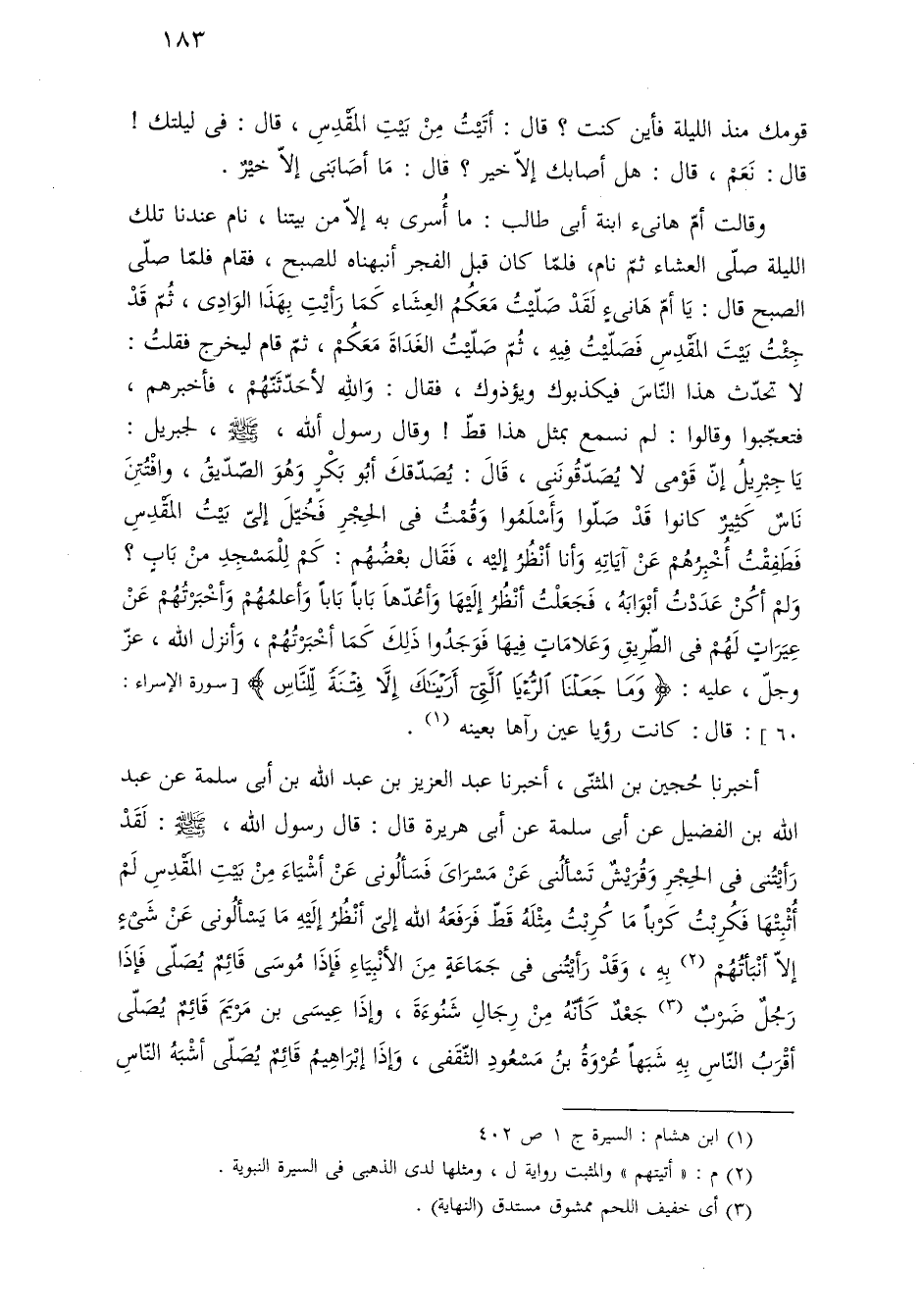 قومك منذ الليلة فأين كنت؟ قال: أتَيْتُ مِنْ بَيْتِ المقدِسِ، قال: فى ليلتك! قال: نَعَمْ، قال: هل أصابك إلّا خير؟ قال: مَا أصَابَنى إلّا خيْرٌ.