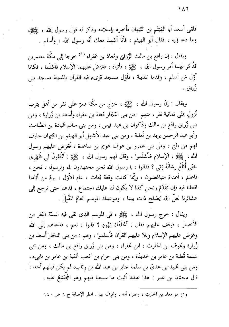 ويقال: خرج رسول اللَّه، -صلى اللَّه عليه وسلم-، فى الموسم الذِى لقى فيه الستّة النّفر من الأنصار، فوقف عليهم فقال: أحُلَفَاءَ يَهُودٍ؟ قالوا: نعم، فدعاهم إلى اللَّه وعَرَض عليهم الإسلام وتلا عليهم القرآن فأسلموا، وهم: من بنى النجّار أسعد بن زُرارة وعَوف بن الحارث، ابن عَفراء، ومن بنى زُريق رافع بن مالك، ومن بَنى سَلمة قُطبة بن عامر بن حَديدَة، ومن بنى حرام بن كعب عُقبة بن عامر بن نابئ، ومن بنى عُبيد بن عدىّ بن سلمة جابر بن عبد اللَّه بن رِئاب، لم يمن قبلهم أحد: قال محمّد بن عمر: هذا عندنا أثبت ما سمعنا فيهم وهو المُجْتَمَعُ عليه.