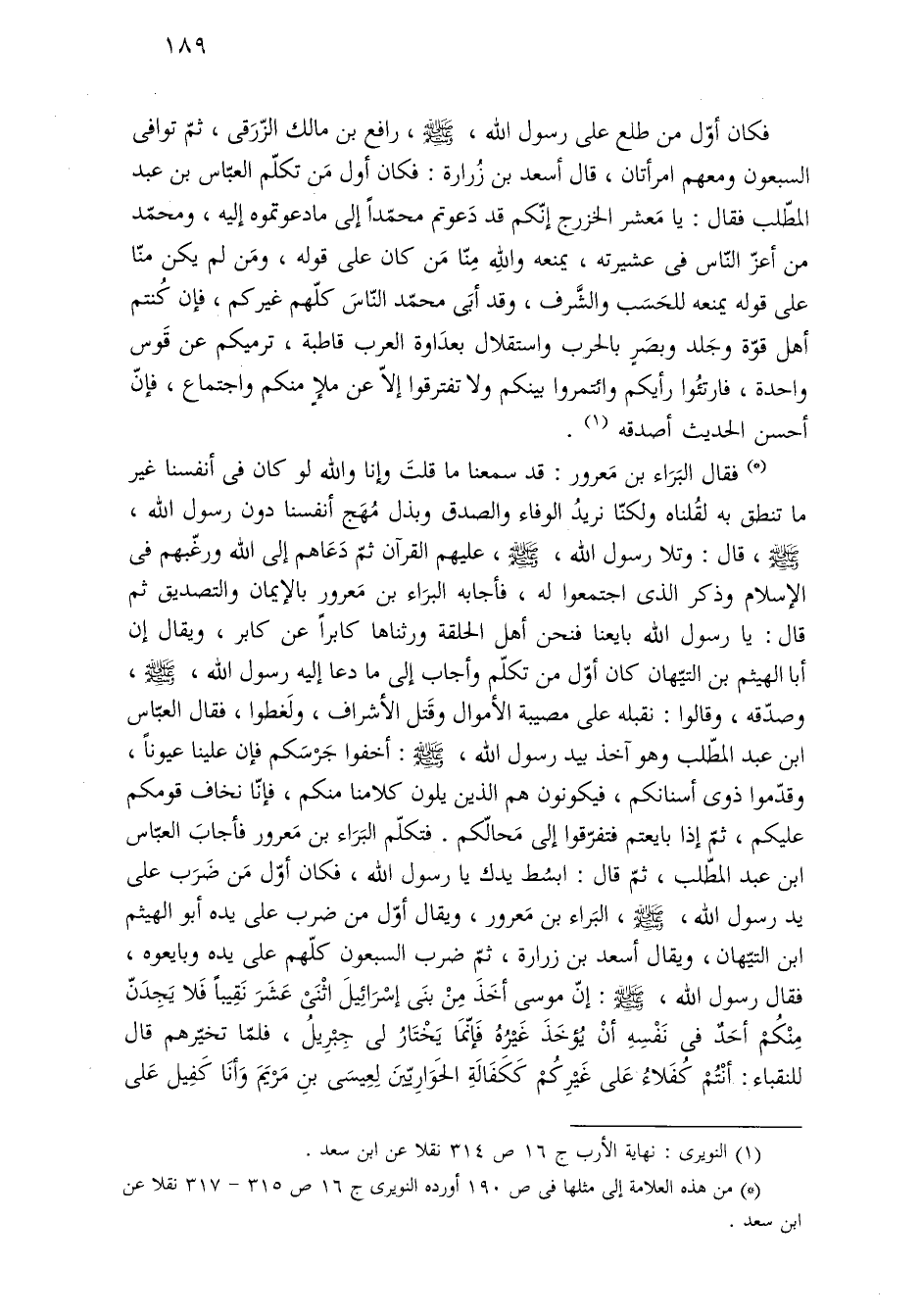 (*) فقال البَرَاء بن مَعرور: قد سمعنا ما قلتَ وإنا واللَّه لو كان فى أنفسنا غير ما تنطق به لقُلناه ولكنّا نريدُ الوفاء والصدق وبذل مُهَج أنفسنا دون رسول اللَّه، -صلى اللَّه عليه وسلم-، قال: وتلا رسول اللَّه، -صلى اللَّه عليه وسلم-، عليهم القرآن ثمّ دَعَاهم إلى اللَّه ورغّبهم في الإسلام وذكر الذى اجتمعوا له، فأجابه البرَاء بن مَعرور بالإيمان والتصديق ثم قال: يا رسول اللَّه بايعنا فنحن أهل الحلقة ورثناها كابرًا عن كابر، ويقال إن أبا الهيثم بن التيّهان كان أوّل من تكلّم وأجاب إلى ما دعا إليه رسول اللَّه، -صلى اللَّه عليه وسلم-، وصدّقه، وقالوا: نقبله على مصيبة الأموال وقَتل الأشراف، ولَغطوا، فقال العبّاس ابن عبد المطّلب وهو آخذ بيد رسول اللَّه، -صلى اللَّه عليه وسلم-: أخفوا جَرْسَكم فإن علينا عيونًا، وقدّموا ذوى أسنانكم، فيكونون هم الذين يلون كلامنا منكم، فإنّا نخاف قومكم عليكم، ثمّ إذا بايعتم فتفرّقوا إلى مَحالّكم. فتكلّم البَرَاء بن مَرور فأجابَ العبّاس ابن عبد المطّلب، ثمّ قال: ابسُط يدك يا رسول اللَّه، فكان أوّل مَن ضَرَب على يد رسول اللَّه، -صلى اللَّه عليه وسلم-، البَراء بن مَعرور، ويقال أوّل من ضرب على يده أبو الهيثم ابن التيّهان، ويقال أسعد بن زرارة، ثمّ ضرب السبعون كلّهم على يده وبايعوه، فقال رسول اللَّه، -صلى اللَّه عليه وسلم-: إنّ موسى أخَذَ مِنْ بنَى إسْرَائِيلَ اثْنَىْ عَشَرَ نَقِيبًا فَلا يَجِدَنّ مِنْكُمْ أحَدٌ فى نَفْسِهِ أنْ يُؤخَذَ غَيْرُهُ فَإنّمَا يَخْتَارُ لى جِبْرِيلُ، فلمّا تخيّرهم قال للنقباء: أنْتُمْ كُفَلاءُ عَلى غَيْرِكُمْ كَكَفَالَةِ الحَوَارِيّينَ لِعِيسَى بنِ مَرْيَمَ وَأنَا كَفِيل عَلى