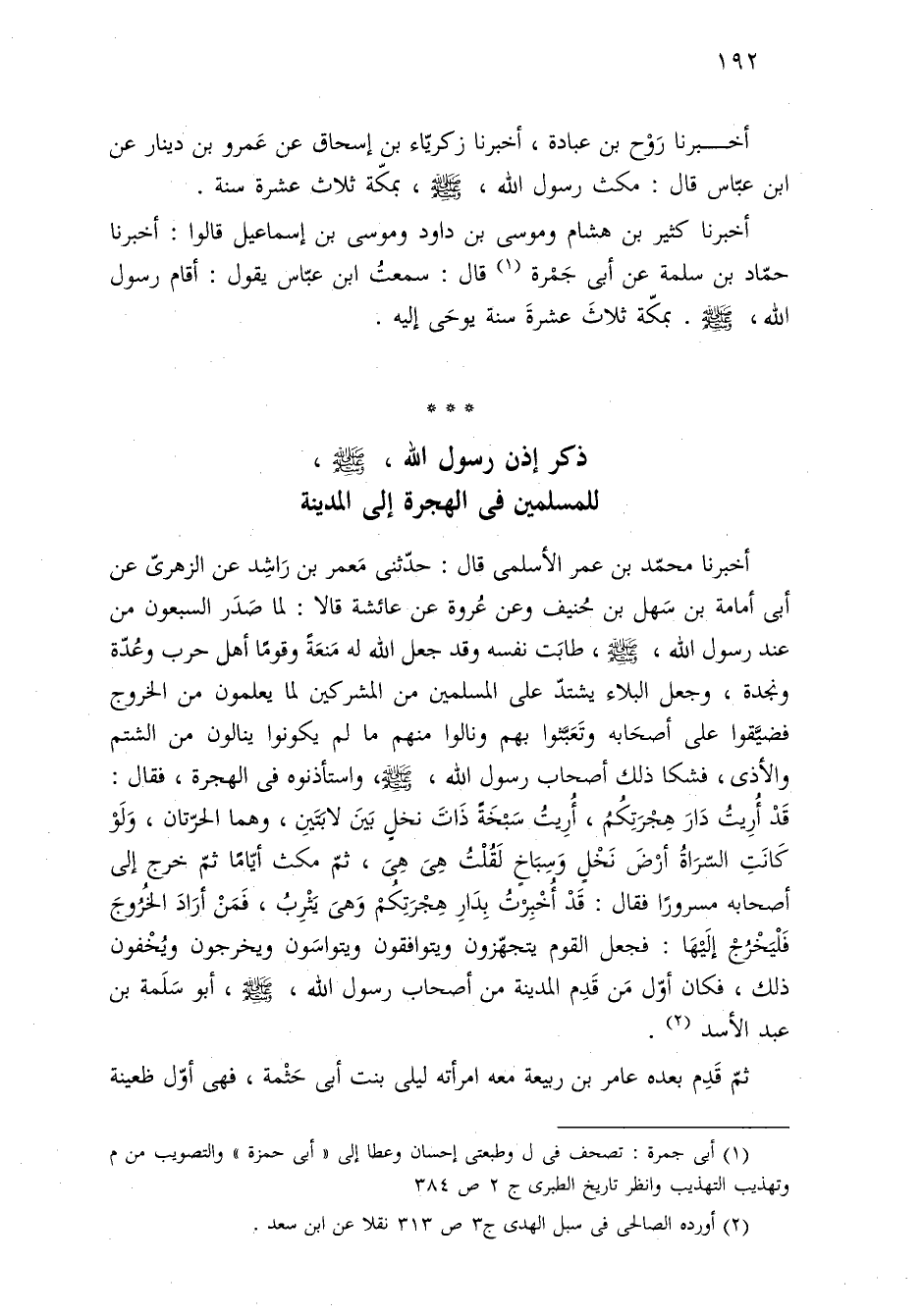 أخبرنا رَوْح بن عبادة، أخبرنا زكريّاء بن إسحاق عن عَمرو بن دينار عن ابن عبّاس قال: مكث رسول اللَّه، -صلى اللَّه عليه وسلم-، بمكّة ثلاث عشرة سنة.