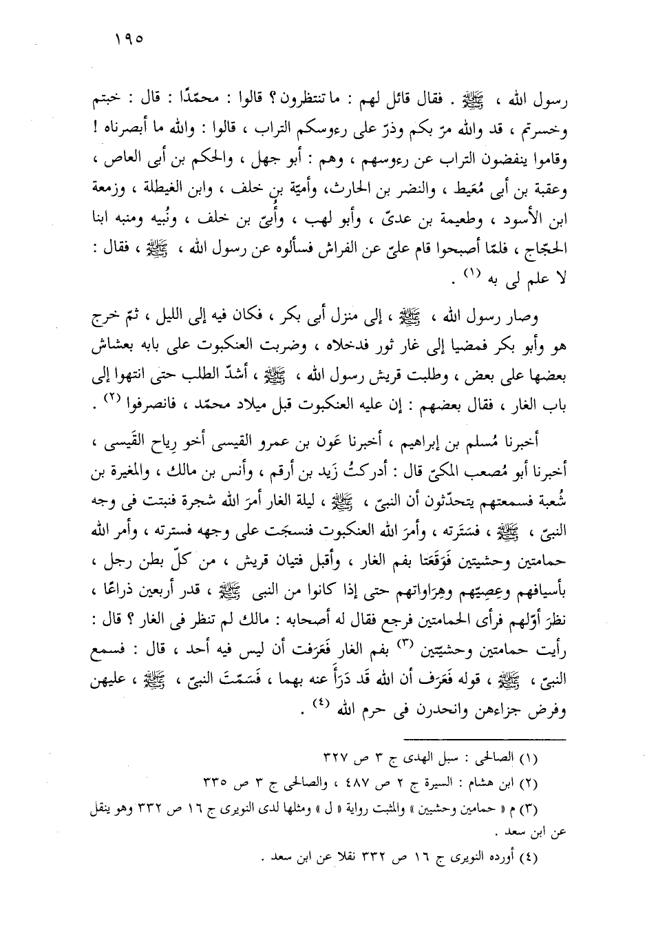 رسول اللَّه، -صلى اللَّه عليه وسلم-. فقال قائل لهم: ما تنتظرون؟ قالوا: محمّدًا: قال: خبتم وخسرتم، قد واللَّه مرّ بكم وذرّ على رءوسكم التراب، قالوا: واللَّه ما أبصرناه! وقاموا ينفضون التراب عن رءوسهم، وهم أبو جهل، والحكم بن أبى العاص، وعقبة بن أبى مُعَيط، والنضر بن الحارث، وأميّة بن خلف، وابن الغيطلة، وزمعة ابن الأسود، وطعيمة بن عدىّ، وأبو لهب، وأُبىّ بن خلف، ونُبيه ومنبه ابنا الحجّاج، فلمّا أصبحوا قام علىّ عن الفراش فسألوه عن رسول اللَّه، -صلى اللَّه عليه وسلم-، فقال: لا علم لى به (¬١).