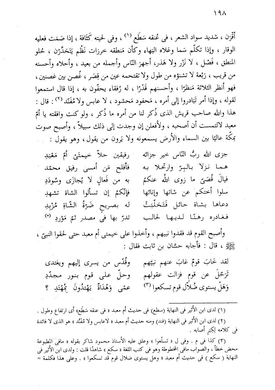 وأصبح القوم قد فقدوا نبيهم، وأخذوا على خيمتى أم معبد حتى لحقوا النبىّ، -صلى اللَّه عليه وسلم-، قال: فأجابه حسَّان بن ثابت فقال: