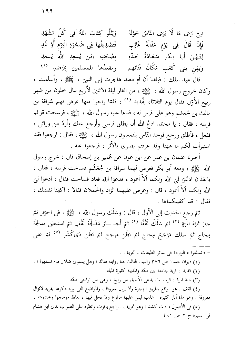 قال عبد الملك: فبلغنا أن أم معبد هاجرت إلى النبىّ، -صلى اللَّه عليه وسلم-، وأسلمت، وكان خروج رسول اللَّه، -صلى اللَّه عليه وسلم-، من الغار ليلة الاثنين لأربع ليال خلون من شهر ربيع الأوّل فقال يوم الثلاثاء بقُديد (¬٢)، فلمّا راحوا منها عرض لهم سُراقة بن مالك بن جُعشم وهو على فرس له، فدعا عليه رسول اللَّه، -صلى اللَّه عليه وسلم-، فرسخت قوائم فرسه، فقال: يا محمّد ادعُ اللَّه أن يطلق فرسى وأرجع عنك وأردّ من ورائى، ففعل، فأطلق ورجع فوجد النّاس يلتمسون رسول اللَّه، -صلى اللَّه عليه وسلم-، فقال: ارجعوا فقد استبرأت لكم ما ههنا وقد عرفتم بصرى بالأثر، فرجعوا عنه.