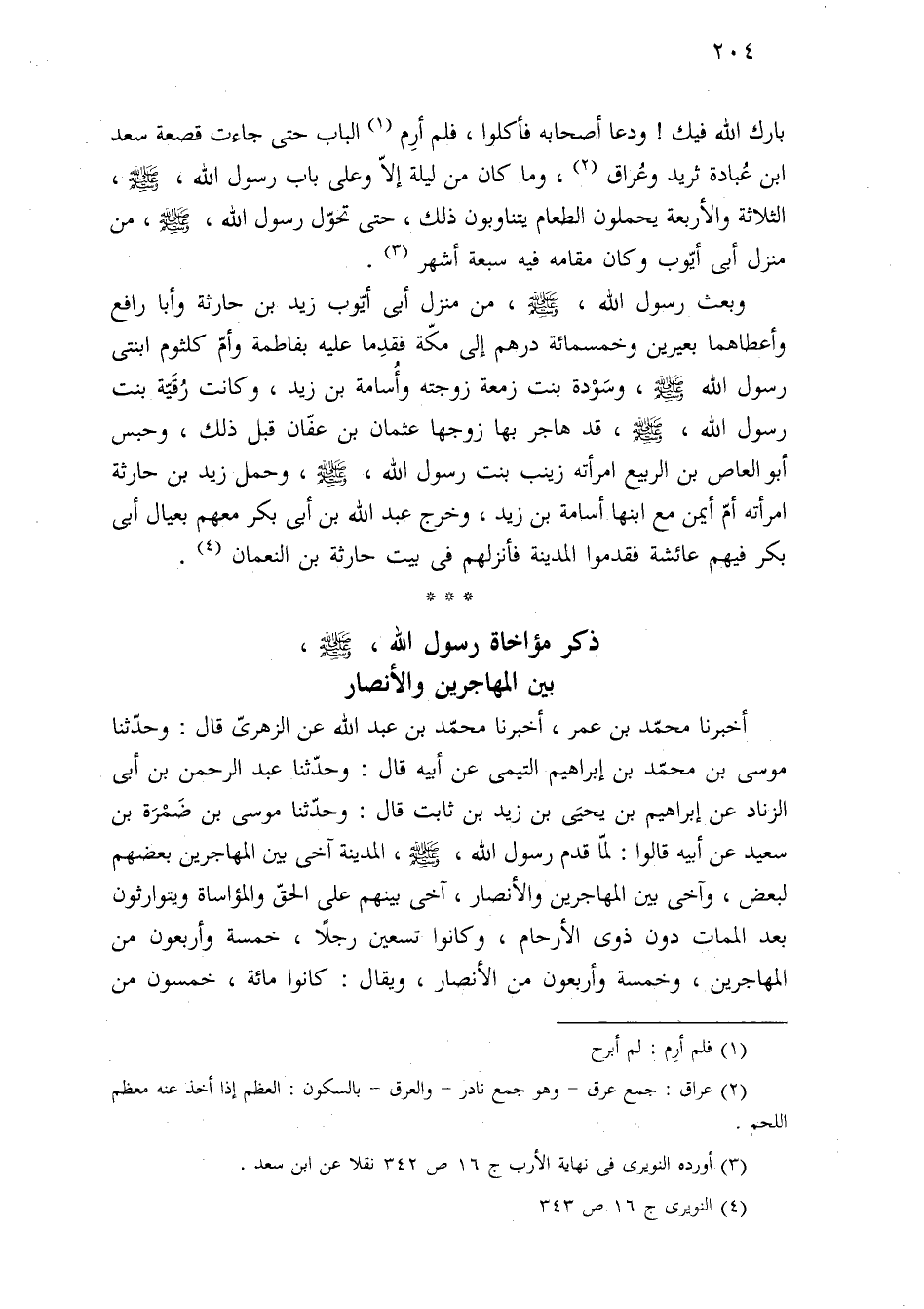 أخبرنا محمّد بن عمر، أخبرنا محمّد بن عبد اللَّه عن الزهرىّ قال: وحدّثنا موسى بن محمّد بن إبراهيم التيمى عن أبيه قال: وحدّثنا عبد الرحمن بن أبى الزناد عن إبراهيم بن يحيَى بن زيد بن ثابت قال: وحدّثنا موسى بن ضَمْرَة بن سعيد عن أبيه قالوا: لمّا قدم رسول اللَّه، -صلى اللَّه عليه وسلم-، المدينة آخى بين المهاجرين بعضهم لبعض، وآخى بين المهاجرين والأنصار، آخى بينهم على الحقّ والمؤاساة ويتوارثون بعد الممات دون ذوى الأرحام، وكانوا تسعين رجلًا، خمسة وأربعون من المهاجرين، وخمسة وأربعون من الأنصار، ويقال: كانوا مائة، خمسون من