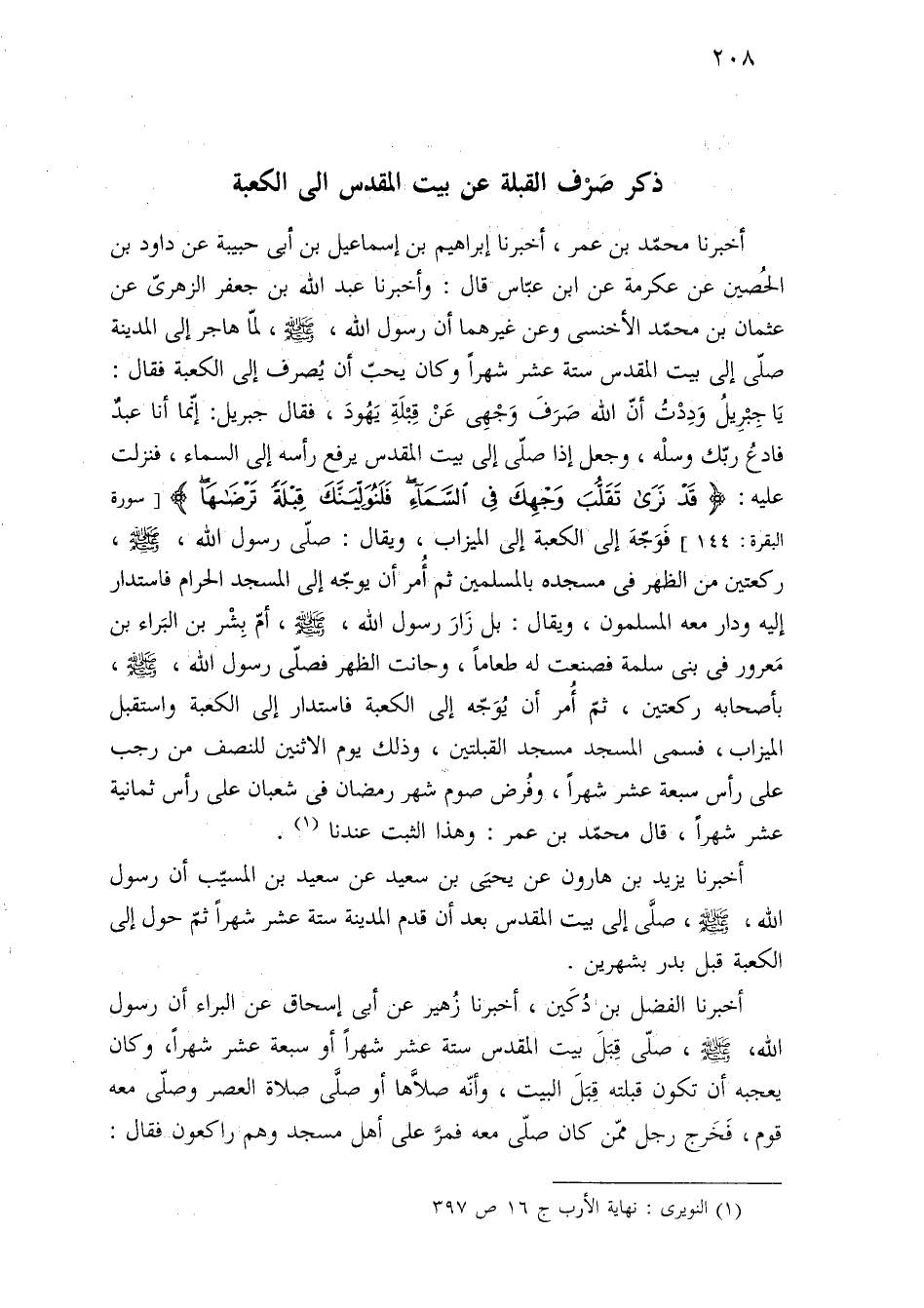أخبرنا الفضل بن دُكَين، أخبرنا زُهير عن أبى إسحاق عن البراء أن رسول اللَّه، -صلى اللَّه عليه وسلم-، صلّى قِبَلَ بيت المقدس ستة عشر شهرًا أو سبعة عشر شهرًا، وكان يعجبه أن تكون قبلته قِبَلَ البيت، وأنّه صلَّاها أو صلَّى صلاة العصر وصلّى معه قوم، فَخَرج رجل ممّن كان صلّى معه فمرَّ على أهل مسجد وهم راكعون فقال: