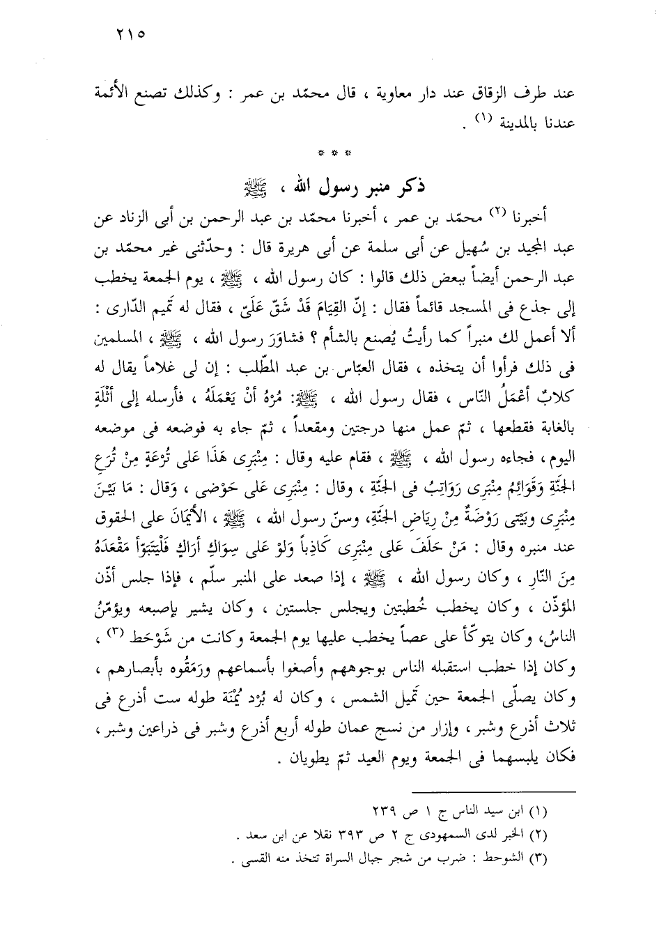 أخبرنا (¬٢) محمّد بن عمر، أخبرنا محمّد بن عبد الرحمن بن أبى الزناد عن عبد المجيد بن سُهيل عن أبى سلمة عن أبى هريرة قال: وحدّثنى غير محمّد بن عبد الرحمن أيضًا ببعض ذلك قالوا: كان رسول اللَّه، -صلى اللَّه عليه وسلم-، يوم الجمعة يخطب إلى جذع فى المسجد قائمًا فقال: إنّ القِيَامَ قَدْ شَقّ عَلَىّ، فقال له تَميم الدّارى: ألا أعمل لك منبرًا كما رأيتُ يُصنع بالشأم؟ فشاوَرَ رسول اللَّه، -صلى اللَّه عليه وسلم-، المسلمين فى ذلك فرأوا أن يتخذه، فقال العبّاس بن عبد المطّلب: إن لى غلامًا يقال له كلابٌ أعْمَلُ النّاس، فقال رسول اللَّه، -صلى اللَّه عليه وسلم-: مُرْهُ أنْ يَعْمَلَهُ، فأرسله إلى أثْلَةٍ بالغابة فقطعها، ثمّ عمل منها درجتين ومقعدًا، ثمّ جاء به فوضعه فى موضعه اليوم، فجاءه رسول اللَّه، -صلى اللَّه عليه وسلم-، فقام عليه وقال: مِنْبَرِى هَذَا عَلى تُرْعَةٍ مِنْ تُرَعِ الجنَّةِ وَقَوَائِمُ مِنْبَرِى رَوَاتِبُ فى الجنَّةِ، وقال: مِنْبَرِى عَلى حَوْضى، وَقال: مَا بَيْنَ مِنْبَرِى وبَيْتى رَوْضَةٌ مِنْ رِيَاضِ الجنَّةِ، وسنّ رسول اللَّه، -صلى اللَّه عليه وسلم-، الأيْمَانَ على الحقوق عند منبره وقال: مَنْ حَلَفَ عَلى مِنْبَرِى كَاذِبًا وَلوْ عَلى سِوَاكِ أرَاكٍ فَلْيَتَبَوّأ مَقْعَدَهُ مِنَ النّارِ، وكان رسول اللَّه، -صلى اللَّه عليه وسلم-، إذا صعد على المنبر سلّم، فإذا جلس أذّن المؤذّن، وكان يخطب خُطبتين ويجلس جلستين، وكان يشير بإصبعه ويؤمّنُ الناسُ، وكان يتوكّأ على عصًا يخطب عليها يوم الجمعة وكانت من شَوْحَط (¬٣)، وكان إذا خطب استقبله الناس بوجوههم وأصغوا بأسماعهم ورَمَقُوه بأبصارهم، وكان يصلّى الجمعة حين تَميل الشمس، وكان له بُرْد يُمْنَة طوله ست أذرع فى ثلاث أذرع وشبر، وإزار من نسج عمان طوله أربع أذرع وشبر فى ذراعين وشبر، فكان يلبسهما فى الجمعة ويوم العيد ثمّ يطويان.