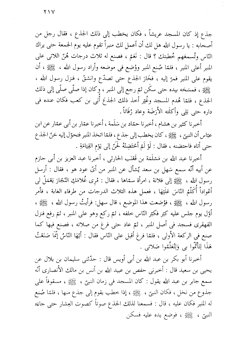 أخبرنا كثير بن هشام، أخبرنا حمّاد بن سَلَمة، أخبرنا عمّار بن أبى عمّار عن ابن عبّاس أن النبىّ، -صلى اللَّه عليه وسلم-، كان يخطب إلى جذع، فلمّا اتخذ المنبر فتحوّل إليه حَنّ الجذع حتى أتاه فاحتضنه، فقال: لَوْ لَمْ أحْتَضِنْهُ لَحَنّ إلى يَوْمِ القِيَامَةِ.