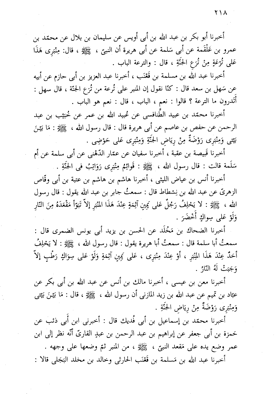 أخبرنا معن بن عيسى، أخبرنا مالك بن أنس عن عبد اللَّه بن أبى بكر عن عبّاد بن تميم عن عبد اللَّه بن زيد المازنى أن رسول اللَّه, -صلى اللَّه عليه وسلم- مَا بَيْنَ بَيْتى وَمِنْبَرِى رَوْضَةٌ مِنْ رِيَاضِ الجَنَّةِ.