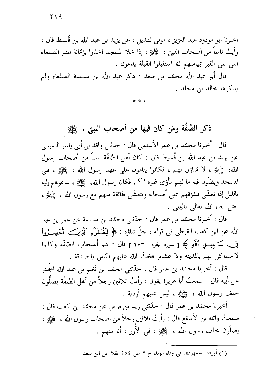 قال: أخبرنا محمّد بن عمر قال: حدّثنى محمّد بن نُعَيم بن عبد اللَّه المُجمّر عن أبيه قال: سمعتُ أبا هريرة يقول: رأيتُ ثلاثين رجلًا من أهل الصُّفَّة يصلُّون خلف رسول اللَّه، -صلى اللَّه عليه وسلم-، ليس عليهم أردية.