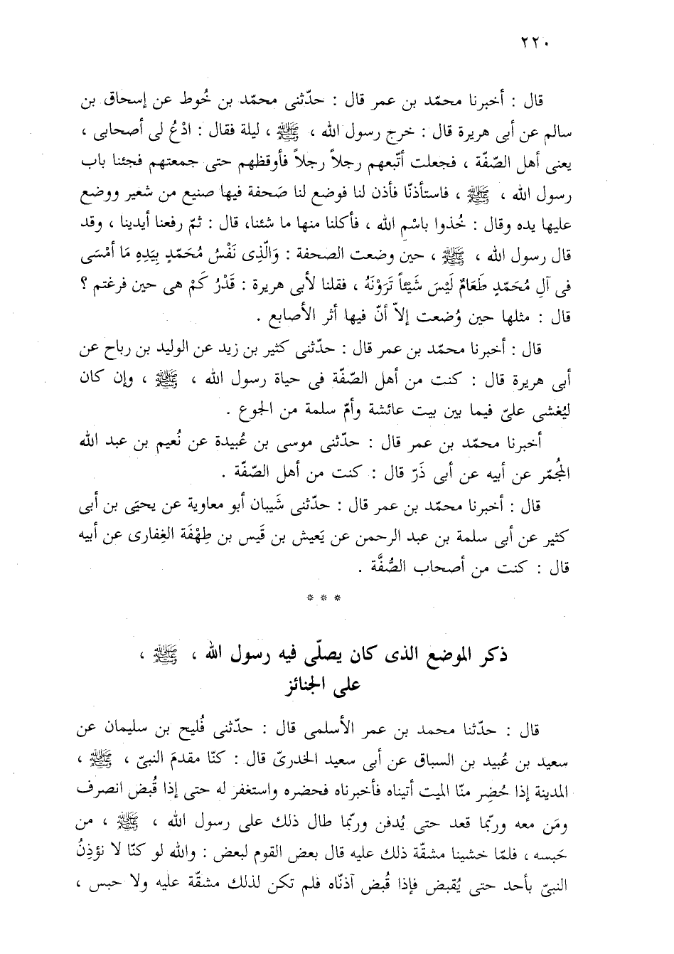 قال: أخبرنا محمّد بن عمر قال: حدّثنى محمّد بن خُوط عن إسحاق بن سالم عن أبى هريرة قال: خرج رسول اللَّه، -صلى اللَّه عليه وسلم-، ليلة فقال: ادْعُ لى أصحابى، يعنى أهل الصّفّة، فجعلت أتّبعهم رجلًا رجلًا فأوقظهم حتى جمعتهم فجئنا باب رسول اللَّه، -صلى اللَّه عليه وسلم-، فاستأذنّا فأذن لنا فوضع لنا صَحفة فيها صنيع من شعير ووضع عليها يده وقال: خُذوا باسْمِ اللَّه، فأكلنا منها ما شئنا، قال: ثمّ رفعنا أيدينا، وقد قال رسول اللَّه، -صلى اللَّه عليه وسلم-، حين وضعت الصحفة: وَالّذِى نَفْسُ مُحَمّدٍ بِيَدِهِ ما أمْسَى فى آلِ مُحَمّدٍ طَعَامٌ لَيْسَ شَيْئًا تَرَوْنَهُ، فقلنا لأبى هريرة: قَدْرُ كَمْ هى حين فرغتم؟ قال: مثلها حين وُضعت إلّا أنّ فيها أثر الأصابع.