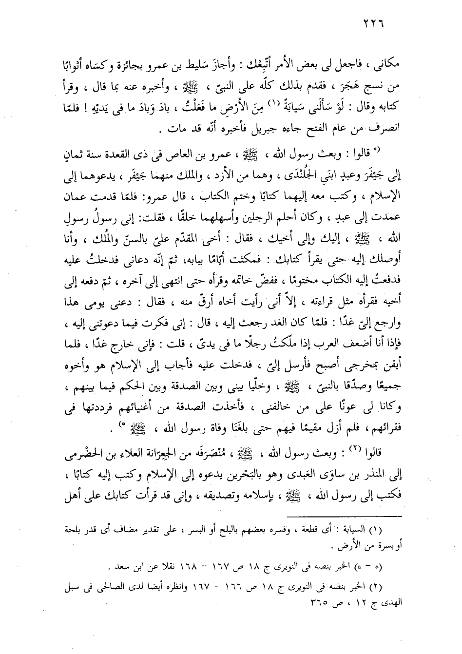 (* قالوا: وبعث رسول اللَّه، -صلى اللَّه عليه وسلم-، عمرو بن العاص فى ذى القعدة سنة ثمانٍ إلى جَيْفَرَ وعبدٍ ابنَىِ الجُلنْدَى، وهما من الأزد، والملك منهما جَيْفَر، يدعوهما إلى الإسلام، وكتب معه إليهما كتابًا وختم الكتاب، قال عمرو: فلمّا قدمت عمان عمدت إلى عبدٍ، وكان أحلم الرجلين وأسهلهما خلقًا، فقلت: إنى رسولُ رسولِ اللَّه، -صلى اللَّه عليه وسلم-، إليك وإلى أخيك، فقال: أخى المقدّم علىّ بالسنّ والمُلك، وأنا أوصلك إليه حتى يقرأ كتابك: فمكثت أيّامًا ببابه، ثمّ إنّه دعانى فدخلتُ عليه فدفعتُ إليه الكتاب مختومًا، ففضّ خاتمه وقرأه حتى انتهى إلى آخره، ثمّ دفعه إلى أخيه فقرأه مثل قراءته، إلّا أنى رأيت أخاه أرقّ منه، فقال: دعنى يومى هذا وارجع إلىّ غدًا: فلمّا كان الغد رجعت إليه، قال: إنى فكرت فيما دعوتنى إليه، فإذا أنا أضعف العرب إذا ملّكتُ رجلًا ما فى يدىّ، قلت: فإنى خارج غدًا، فلما أيقن بمخرجى أصبح فأرسل إلىّ، فدخلت عليه فأجاب إلى الإسلام هو وأخوه جميعًا وصدّقا بالنبىّ، -صلى اللَّه عليه وسلم-، وخلّيا بينى وبين الصدقة وبين الحكم فيما بينهم، وكانا لى عونًا على من خالفنى، فأخذت الصدقة من أغنيائهم فرددتها فى فقرائهم، فلم أزل مقيمًا فيهم حتى بلغَنَا وفاة رسول اللَّه، -صلى اللَّه عليه وسلم- *).
