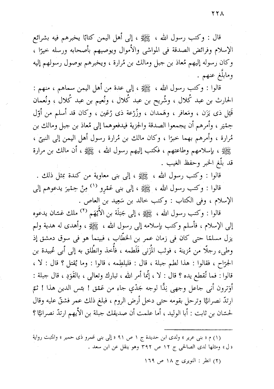 قال: وكتب رسول اللَّه، -صلى اللَّه عليه وسلم-، إلى أهل اليمن كتابًا يخبرهم فيه بشرائع الإسلام وفرائض الصدقة فى المواشى والأموال ويوصيهم بأصحابه ورسله خيرًا، وكان رسوله إليهم مُعاذ بن جبل ومالك بن مُرارة، ويخبرهم بوصول رسولهم إليه وما بلَّغ عنهم.