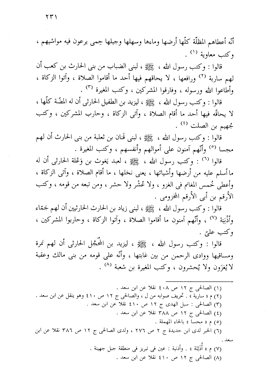 قالوا: وكتب رسول اللَّه، -صلى اللَّه عليه وسلم-، لبنى الضباب من بنى الحارث بن كعب أن لهم ساربة (¬٢) ورافعها، لا يحاقهم فيها أحد ما أقاموا الصلاة، وآتوا الزكاة، وأطاعوا اللَّه ورسوله، وفارقوا المشركين، وكتب المغيرة (¬٣).