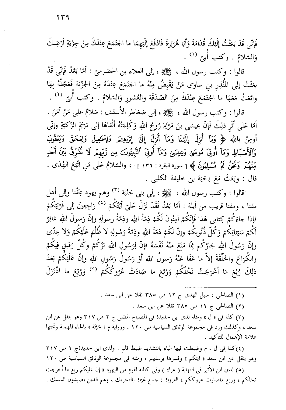 قالوا: وكتب رسول اللَّه، -صلى اللَّه عليه وسلم-، إلى ضغاطر الأسقف: سَلامٌ على مَنْ آمَنَ. أمّا عَلى أثَرِ ذلِكَ فَإنّ عِيسَى بنَ مَرْيَمَ رُوحُ اللَّه وَكَلِمَتُهُ ألْقاهَا إلى مَرْيَمَ الزّكيّةِ وإنّى أومِنُ باللَّه {وَمَا أُنْزِلَ إِلَى إِبْرَاهِيمَ وَإِسْمَاعِيلَ وَإِسْحَاقَ وَيَعْقُوبَ وَالْأَسْبَاطِ وَمَا أُوتِيَ مُوسَى وَعِيسَى وَمَا أُوتِيَ النَّبِيُّونَ مِنْ رَبِّهِمْ لَا نُفَرِّقُ بَيْنَ أَحَدٍ مِنْهُمْ وَنَحْنُ لَهُ مُسْلِمُونَ} [سورة البقرة: ١٣٦]، والسّلامُ عَلى مَنِ اتّبَعَ الهُدَى. قال: وبَعَثَ مَعَ دِحْيَة بن خليفة الكلبى.