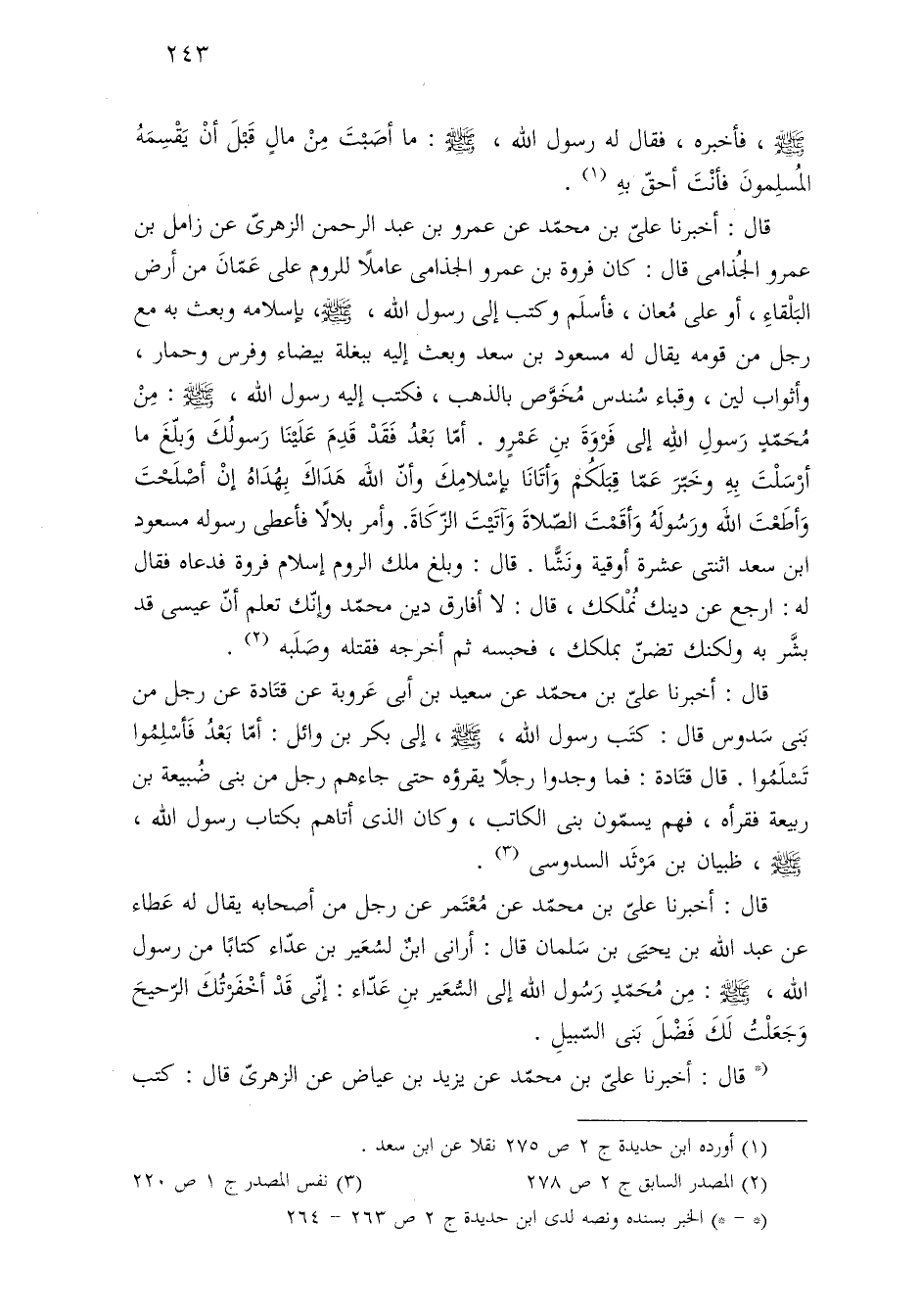قال: أخبرنا علىّ بن محمّد عن عمرو بن عبد الرحمن الزهرىّ عن زامل بن عمرو الجُذامى قال: كان فروة بن عمرو الجذامى عاملًا للروم على عَمّانَ من أرض البَلْقاءِ، أو على مُعان، فأسلَم وكتب إلى رسول اللَّه، -صلى اللَّه عليه وسلم-، بإسلامه وبعث به مع رجل من قومه يقال له مسعود بن سعد وبعث إليه ببغلة بيضاء وفرس وحمار، وأثواب لين، وقباء سُندس مُخَوَّص بالذهب، فكتب إليه رسول اللَّه، -صلى اللَّه عليه وسلم-: مِنْ مُحَمّدٍ رَسولِ اللَّهِ إلى فَرْوَةَ بنِ عَمْرٍو. أمّا بَعْدُ فَقَدْ قَدِمَ عَلَيْنَا رَسولُكَ وَبلّغَ ما أرْسَلْتَ بِهِ وخَبّرَ عَمّا قِبَلَكُمْ وَأتَانَا بإسْلامِكَ وأنّ اللَّه هَدَاكَ بِهُدَاهُ إنْ أصْلَحْتَ وَأطَعْتَ اللَّه ورَسُولَهُ وَأقَمْتَ الصّلاةَ وَآتَيْتَ الزّكَاةَ. وأمر بلالًا فأعطى رسوله مسعود ابن سعد اثنتى عشرة أوقية ونَشًّا. قال: وبلغ ملك الروم إسلام فروة فدعاه فقال له: ارجع عن دينك نُمْلكك، قال: لا أفارق دين محمّد وإنّك تعلم أنّ عيسى قد بشَّر به ولكنك تضنّ بملكك، فحبسه ثم أخرجه فقتله وصَلَبه (¬٢).