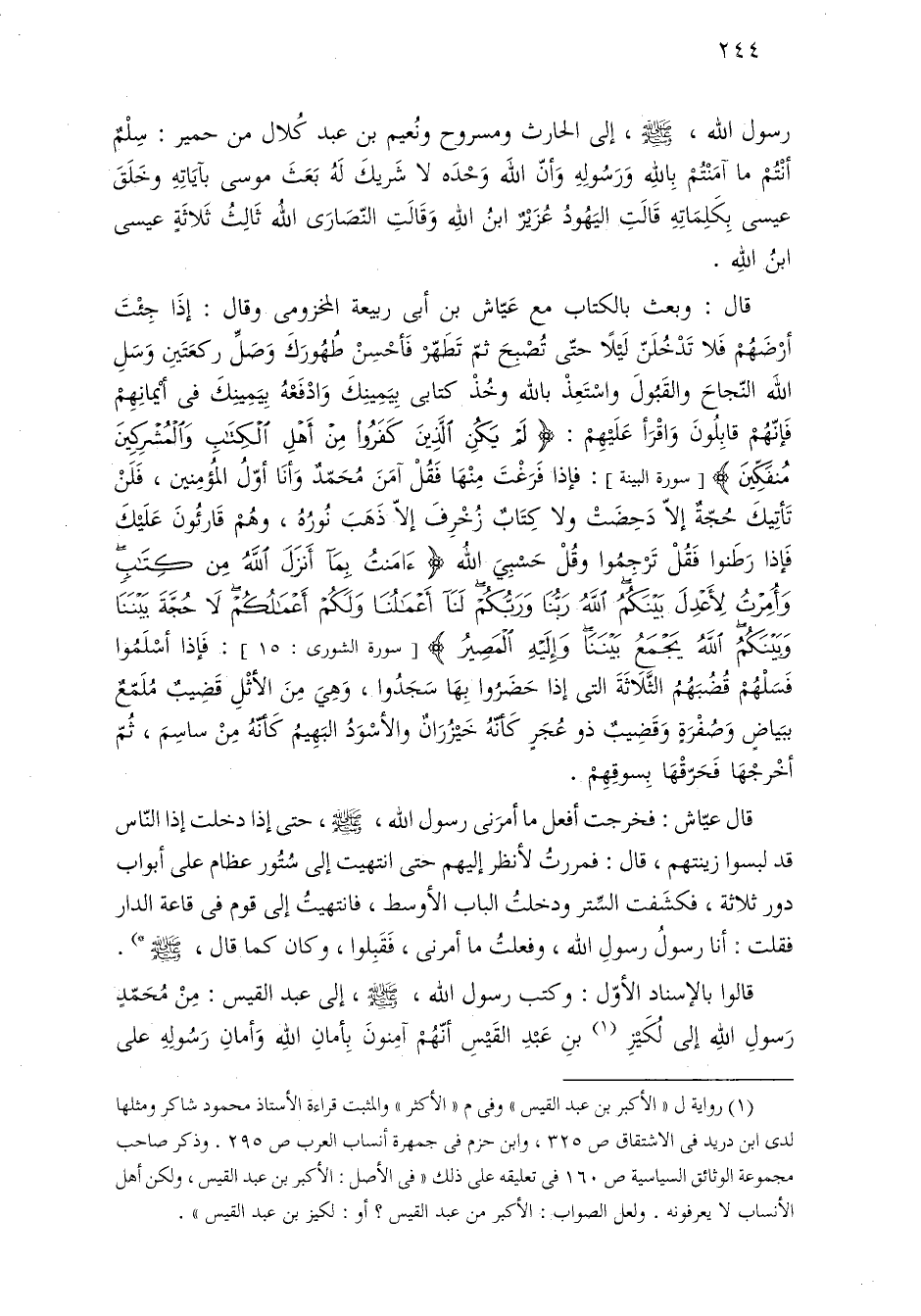قال: وبعث بالكتاب مع عَيّاش بن أبى ربيعة المخزومى وقال: إذَا جِئْتَ أرْضَهُمْ فَلا تَدْخُلَنّ لَيْلًا حتّى تُصْبِحَ ثمّ تَطَهّرْ فَأحْسِنْ طُهُورَكَ وَصَلِّ ركعَتَيِن وَسَلِ اللَّه النّجاحَ والقَبُولَ واسْتَعِذْ باللَّه وخُذْ كتابى بِيَمِينِكَ وَادْفَعْهُ بِيَمِينِكَ فى أيْمانِهِمْ فَإنّهُمْ قابِلُونَ وَاقْرَأ عَلَيْهِمْ: {لَمْ يَكُنِ الَّذِينَ كَفَرُوا مِنْ أَهْلِ الْكِتَابِ وَالْمُشْرِكِينَ مُنْفَكِّينَ} [سورة البينة]: فإذا فَرَغْتَ مِنْهَا فَقُلْ آمَنَ مُحَمّدٌ وَأنَا أوّلُ المُؤمِنين، فَلَنْ تَأتِيكَ حُجّةٌ إلّا دَحِضَتْ ولا كِتَابٌ زُخْرِفَ إلّا ذَهَبَ نُورُهُ، وهُمْ قَارئُونَ عَلَيْكَ فَإذا رَطَنوا فَقُلْ تَرْجموا وقُلْ حَسْبِيَ اللَّه {آمَنْتُ بِمَا أَنْزَلَ اللَّهُ مِنْ كِتَابٍ وَأُمِرْتُ لِأَعْدِلَ بَيْنَكُمُ اللَّهُ رَبُّنَا وَرَبُّكُمْ لَنَا أَعْمَالُنَا وَلَكُمْ أَعْمَالُكُمْ لَا حُجَّةَ بَيْنَنَا وَبَيْنَكُمُ اللَّهُ يَجْمَعُ بَيْنَنَا وَإِلَيْهِ الْمَصِيرُ} [سورة الشورى: ١٥]: فَإذا أسْلَمُوا فَسَلْهُمْ قُضُبَهُمُ الثَّلَاثَةَ التى إذا حَضَرُوا بِهَا سَجَدُوا، وَهِىَ مِنَ الأثْلِ قَضِيبٌ مُلَمّعٌ ببَياضٍ وَصُفْرَةٍ وَقَضِيبٌ ذو عُجَرٍ كَأنّهُ خَيْزُرَانٌ والأسْوَدُ البَهِيمُ كَأنّهُ مِنْ ساسِمَ، ثُمّ أخْرجْهَا فَحَرّقْهَا بِسوقِهِمْ.