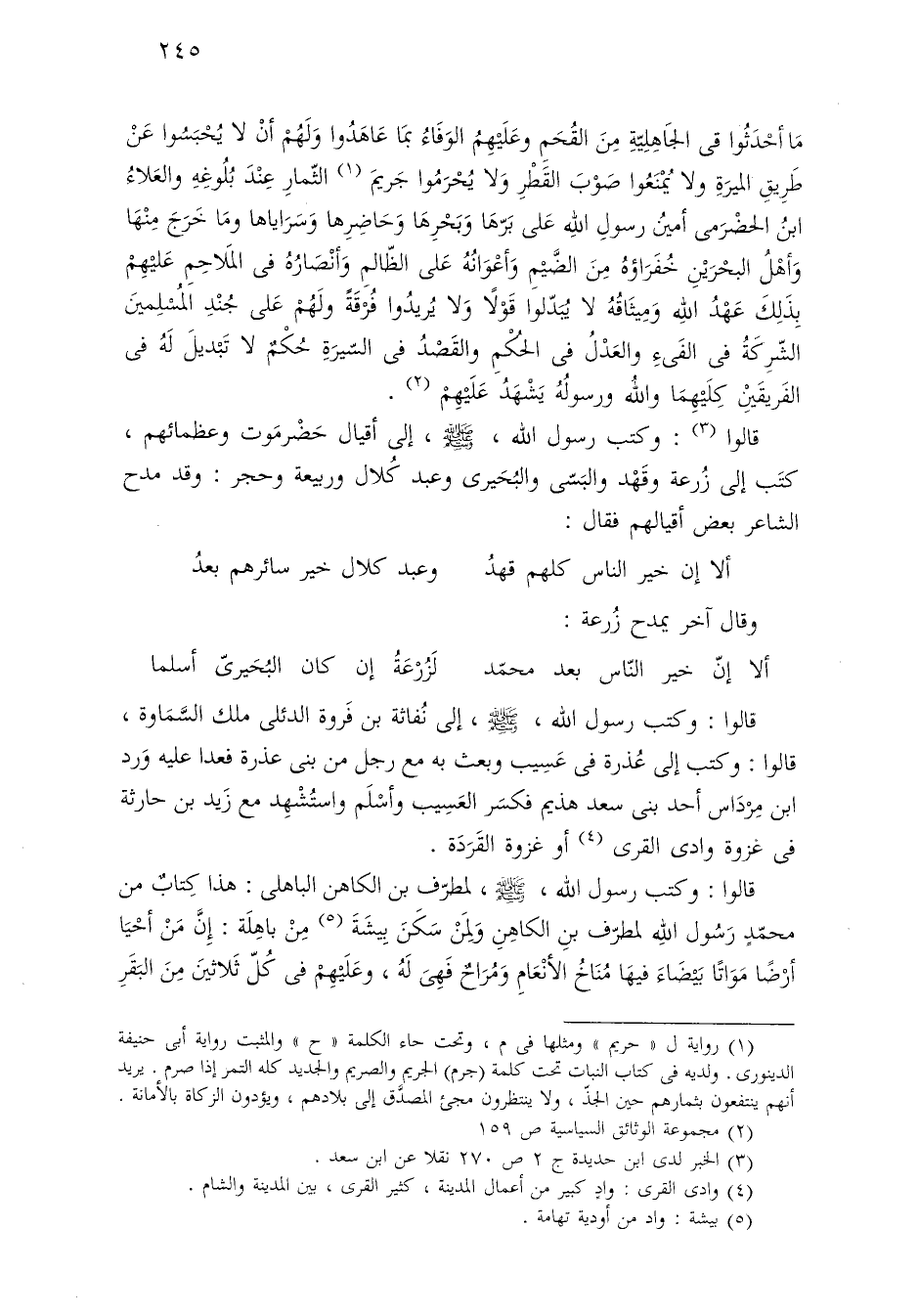 مَا أحْدَثُوا فى الجَاهِلِيّةِ مِنَ القُحَمِ وعَلَيْهِمُ الوَفَاءُ بمَا عَاهَدُوا وَلَهُمْ أنْ لا يُحْبَسُوا عَنْ طَرِيقِ الميرَةِ ولا يُمْنَعُوا صَوْبَ القَطْرِ وَلا يُحْرَمُوا جَريمَ (¬١) الثّمارِ عِنْدَ بُلُوغِهِ والعَلاءُ ابنُ الحضْرَمى أمينُ رسولِ اللَّه عَلى بَرّهَا وَبَحْرِهَا وَحَاضِرِها وَسَرَاياها ومَا خَرَجَ مِنْهَا وَأَهْلُ البحْرَيْنِ خُفَرَاؤهُ مِنَ الضَّيْمِ وَأعْوَانُهُ عَلى الظّالمِ وَأنْصَارُهُ فى المَلاحِمِ عَليْهِمْ بِذَلِكَ عَهْدُ اللَّه وَمِيثَاقُهُ لا يُبَدّلوا قَوْلًا وَلا يُريدُوا فُرْقَةً ولَهُمْ عَلى جُنْدِ المُسْلِمينَ الشّرِكَة فى الفَئِ والعَدْلُ فى الحكْمِ والقَصْدُ فى السّيرَةِ حُكْمٌ لا تَبْديلَ لَهُ فى الفَريقَين كِلَيْهِمَا واللَّهُ ورسولُهُ يَشْهَدُ عَلَيْهِمْ (¬٢).