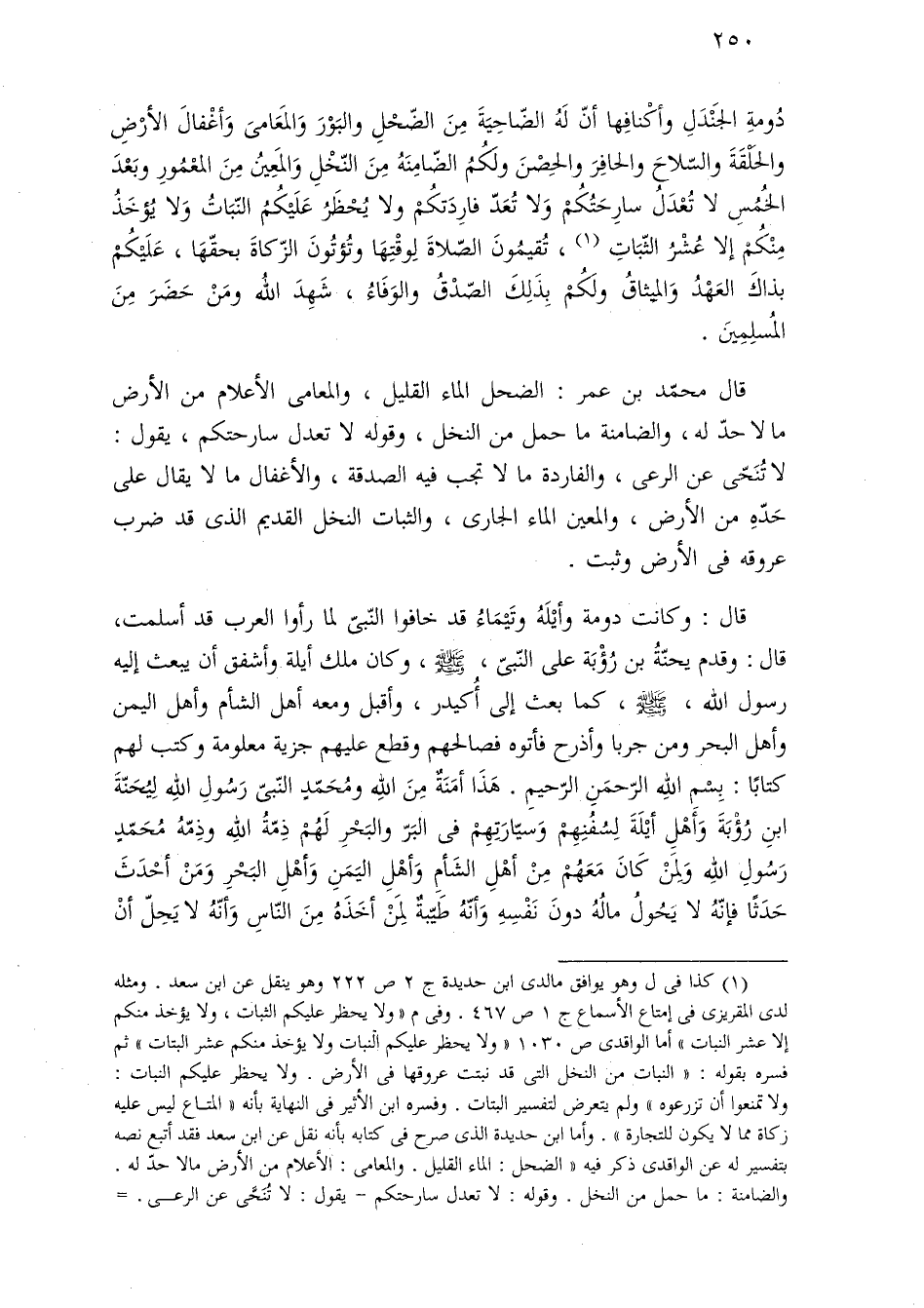 دُومةِ الجَنْدَلِ وأكْنافِها أنّ لَهُ الضّاحِيَةَ مِنَ الضّحْلِ والبَوْرَ وَالمَعَامىَ وَأغْفالَ الأرْضِ والحلْقَةَ والسّلاحَ والحافِرَ والحِصْنَ ولَكُمُ الضّامِنَهُ مِنَ النّخْلِ وَالمَعِينُ مِنَ المعْمُورِ وبَعْدَ الخُمُيس لا تُعْدَلُ سارِحَتُكُمْ وَلا تُعَدّ فارِدَتكُمْ ولا يُحْظَرُ عَلَيْكُمُ النّبَاتُ وَلا يُؤخَذُ منْكُمْ إلا عُشْرُ الثّبَاتِ (¬١)، تُقيمُونَ الصّلاةَ لِوقْتِهَا وتُؤتُونَ الزّكاةَ بحقّهَا، عَلَيْكُمْ بذاكَ العَهْدُ وَالميثاقُ ولَكُمْ بِذَلِكَ الصّدْقُ والوَفَاءُ، شَهِدَ اللَّه ومَنْ حَضَرَ مِنَ المُسلِمِينَ.