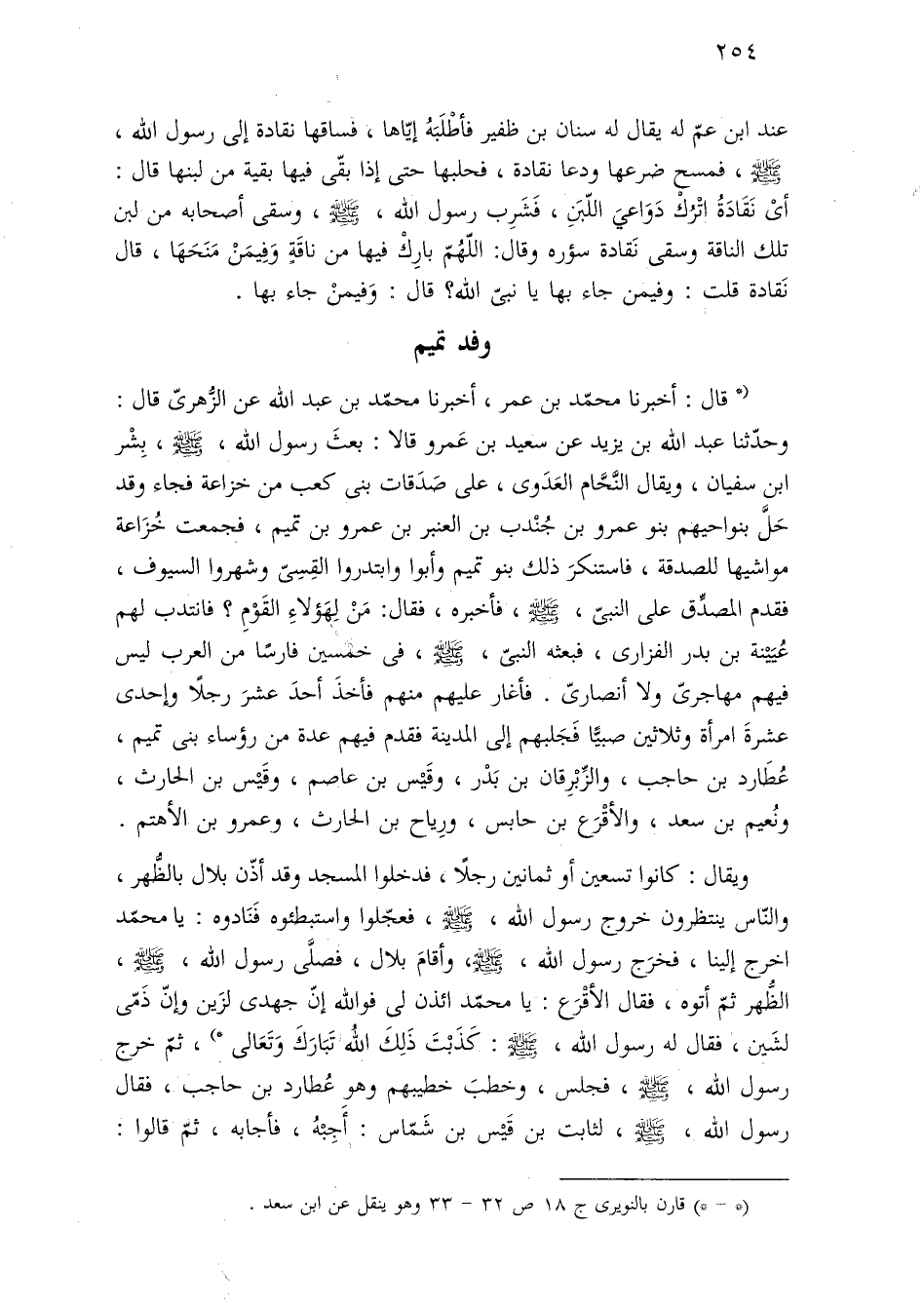 (* قال: أخبرنا محمّد بن عمر، أخبرنا محمّد بن عبد اللَّه عن الزُّهرىّ قال: وحدّثنا عبد اللَّه بن يزيد عن سعيد بن عَمرو قالا: بعثَ رسول اللَّه، -صلى اللَّه عليه وسلم-، بِشْر ابن سفيان، ويقال النَّحَّام العَدَوى، على صَدَقات بنى كعب من خزاعة فجاء وقد حَلَّ بنواحيهم بنو عمرو بن جُنْدب بن العنبر بن عمرو بن تميم، فجمعت خُزَاعة مواشيها للصدقة، فاستنكرَ ذلك بنو تميم وأبوا وابتدروا القِسِىّ وشهروا السيوف، فقدم المصدِّق على النبىّ، -صلى اللَّه عليه وسلم-، فأخبره، فقال: مَنْ لِهَؤلاءِ القَوْمِ؟ فانتدب لهم عُيَيْنة بن بدر الفزارى، فبعثه النبىّ، -صلى اللَّه عليه وسلم-، فى خمسين فارسًا من العرب ليس فيهم مهاجرىّ ولا أنصارىّ. فأغار عليهم منهم فأخذَ أحدَ عشرَ رجلًا وإحدى عشرةَ امرأة وثلاثين صبيًّا فَجَلبهم إلى المدينة فقدم فيهم عدة من رؤساء بنى تميم، عُطَارد بن حاجب، والزِّبْرِقان بن بَدْر، وقَيْس بن عاصم، وقَيْس بن الحارث، ونُعيم بن سعد، والأقْرَع بن حابس، ورِياح بن الحارث، وعمرو بن الأهتم.