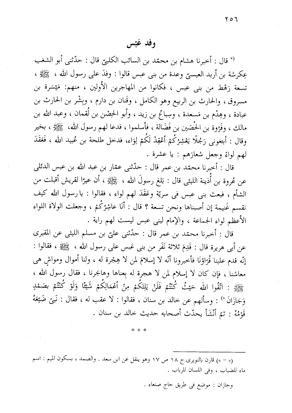 قال: أخبرنا محمّد بن عمر قال: حدّثنى علىّ بن مسلم الليثى عن المقبرى عن أبى هريرة قال: قَدِمَ ثلاثة نَفَر من بنى عَبس على رسول اللَّه، -صلى اللَّه عليه وسلم-، فقالوا: إنّه قدم علينا قُرّاؤنَا فأخبرونا أنّه لا إسلامَ لمن لا هِجْرة له، ولنا أموال ومواشٍ هى معاشنا، فإن كان لا إسلام لمن لا هجرة له بِعناها وهاجَرنا، فقال رسول اللَّه، -صلى اللَّه عليه وسلم-: اتّقُوا اللَّه حَيْثُ كُنْتُمْ فَلَنْ يَلِتَكُمْ مِنْ أعْمَالِكُمْ شَيْئًا وَلَوْ كُنْتُمْ بصَمْدٍ وَجَازَانَ *): وسألهم عن خالد بن سنان، فقالوا: لا عقب له، فقال: نَبىّ ضَيّعَهُ قَوْمُهُ: ثمّ أنْشَأ يحدّث أصحابه حديث خالد بن سنان.