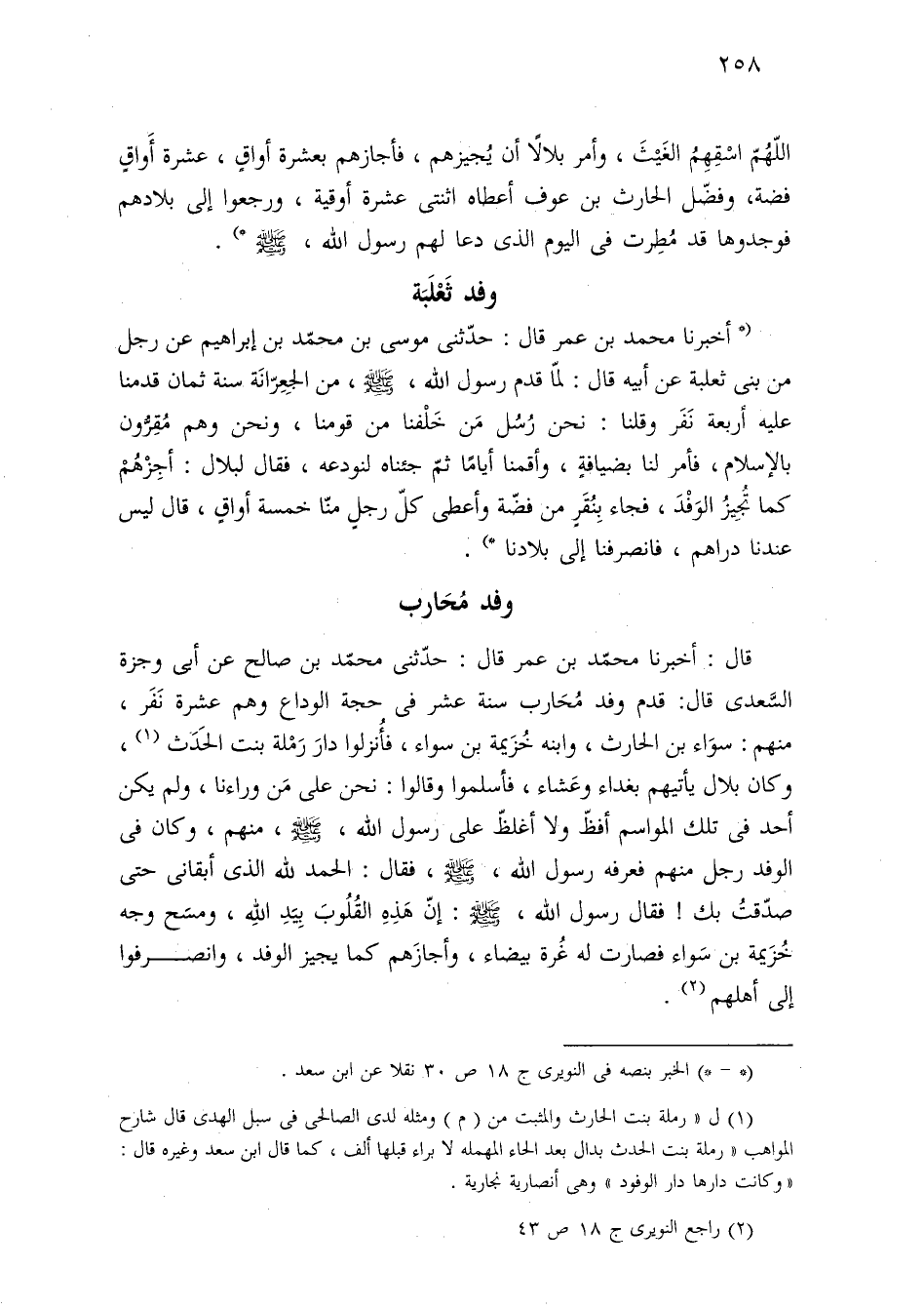 (* أخبرنا محمد بن عمر قال: حدّثنى موسى بن محمّد بن إبراهيم عن رجل من بنى ثعلبة عن أبيه قال: لمّا قدم رسول اللَّه، -صلى اللَّه عليه وسلم-، من الجِعِرّانَة سنة ثمان قدمنا عليه أربعة نَفَر وقلنا: نحن رُسُل مَن خَلْفنا من قومنا، ونحن وهم مُقِرُّون بالإسلام، فأمر لنا بضيافةٍ، وأقمنا أيامًا ثمّ جئناه لنودعه، فقال لبلال: أجِزْهُمْ كما تُجِيزُ الوَفْدَ، فجاء بِنُقَرٍ من فضّة وأعطى كلّ رجلٍ منّا خمسة أواقٍ، قال ليس عندنا دراهم، فانصرفنا إلى بلادنا *).