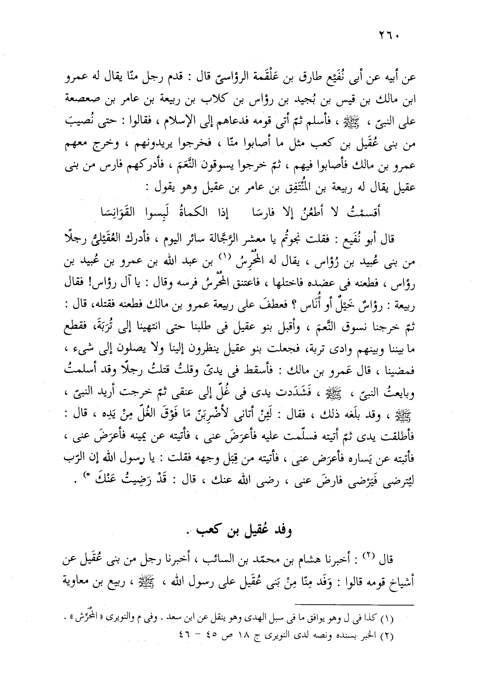 عن أبيه عن أبى نُفَيْع طارق بن عَلْقَمة الرؤاسىّ قال: قدم رجل منّا يقال له عمرو ابن مالك بن قيس بن بُجيد بن رؤاس بن كلاب بن ربيعة بن عامر بن صعصعة على النبىّ، -صلى اللَّه عليه وسلم-، فأسلم ثمّ أتى قومه فدعاهم إلى الإسلام، فقالوا: حتى نُصيبَ من بنى عُقَيل بن كعب مثل ما أصابوا منّا، فخرجوا يريدونهم، وخرج معهم عمرو بن مالك فأصابوا فيهم، ثمّ خرجوا يسوقون النَّعَمَ، فأدركهم فارس من بنى عقيل يقال له ربيعة بن المُنْتَفِق بن عامر بن عقيل وهو يقول: