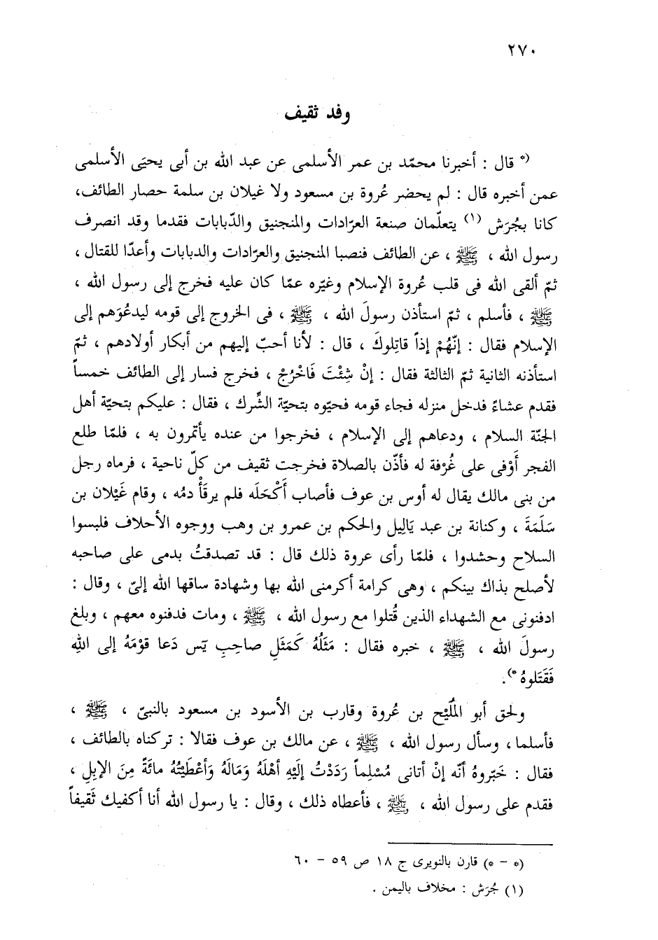 (* قال: أخبرنا محمّد بن عمر الأسلمى عن عبد اللَّه بن أبى يحيَى الأسلمى عمن أخبره قال: لم يحضر غروة بن مسعود ولا غيلان بن سلمة حصار الطائف، كانا بجُرَش (¬١) يتعلّمان صنعة العرّادات والمنجنيق والدّبابات فقدما وقد انصرف رسول اللَّه، -صلى اللَّه عليه وسلم-، عن الطائف فنصبا المنجنيق والعرّادات والدبابات وأعدّا للقتال، ثمّ ألقى اللَّه فى قلب عُروة الإسلام وغيّره عمّا كان عليه فخرج إلى رسول اللَّه، -صلى اللَّه عليه وسلم-، فأسلم، ثمّ استأذن رسولَ اللَّه، -صلى اللَّه عليه وسلم-، فى الخروج إلى قومه ليدعُوَهم إلى الإسلام فقال: إنّهُمْ إذًا قاتِلوكَ، قال: لأنا أحبّ إليهم من أبكار أولادهم، نمّ استأذنه الثانية ثمّ الثالثة فقال: إنْ شِئْتَ فَاخْرُجْ، فخرج فسار إلى الطائف خمسًا فقدم عشاءً فدخل منزله فجاء قومه فحيّوه بتحيّة الشِّرك، فقال: عليكم بتحيّة أهل الجنّة السلام، ودعاهم إلى الإسلام، فخرجوا من عنده يأتمرون به، فلمّا طلع الفجر أَوْفى على غُرْفة له فأذّن بالصلاة فخرجت ثقيف من كلّ ناحية، فرماه رجل من بنى مالك يقال له أوس بن عوف فأصاب أَكْحَلَه فلم يرقَأْ دمُه، وقام غَيْلان بن سَلَمَةَ، وكنانة بن عبد يَالِيل والحكم بن عمرو بن وهب ووجوه الأحلاف فلبسوا السلاح وحشدوا، فلمّا رأى عروة ذلك قال: قد تصدقتُ بدمى على صاحبه لأصلح بذاك بينكم، وهى كرامة أكرمنى اللَّه بها وشهادة ساقها اللَّه إلىّ، وقال: ادفنونى مع الشهداء الذين قُتلوا مع رسول اللَّه، -صلى اللَّه عليه وسلم-، ومات فدفنوه معهم، وبلغ رسولَ اللَّه، -صلى اللَّه عليه وسلم-، خبره فقال: مَثَلُهُ كَمَثَلِ صاحِبِ يَس دَعا قوْمَهُ إلى اللَّه فَقَتَلوهُ *).
