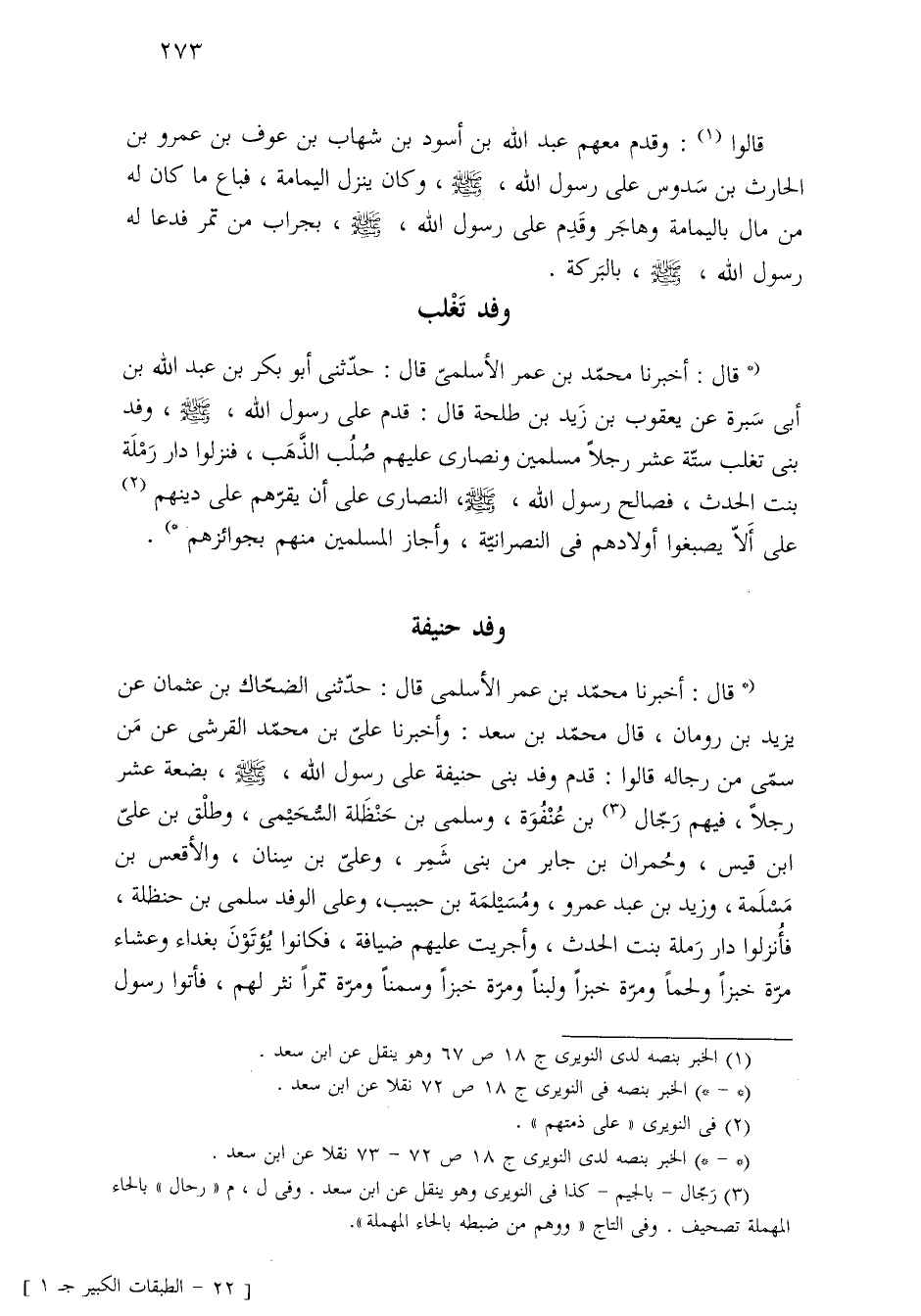 (* قال: أخبرنا محمّد بن عمر الأسلمىّ قال: حدّثنى أبو بكر بن عبد اللَّه بن أبى سَبرة عن يعقوب بن زَيد بن طلحة قال: قدم على رسول اللَّه، -صلى اللَّه عليه وسلم-، وفد بنى تغلب ستّة عشر رجلًا مسلمين ونصارى عليهم صُلُب الذَّهَب، فنزلوا دار رَمْلَة بنت الحدث، فصالح رسول اللَّه، -صلى اللَّه عليه وسلم-، النصارى على أن يقرّهم على دينهم (¬٢) على أَلّا يصبغوا أولادهم فى النصرانيّة، وأجاز السلمين منهم بجوائزهم *).