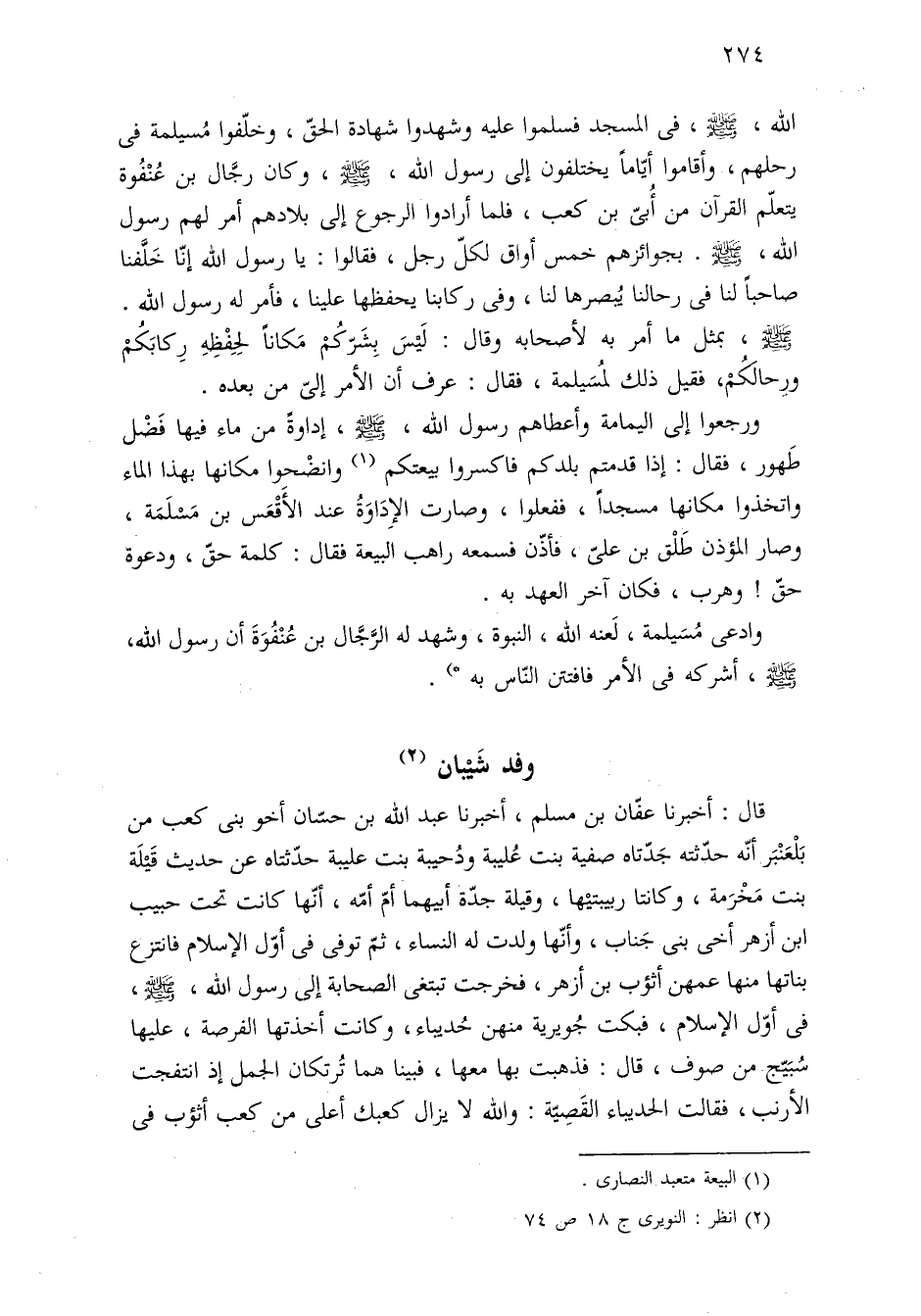 اللَّه، -صلى اللَّه عليه وسلم-، فى المسجد فسلموا عليه وشهدوا شهادة الحقّ، وخلّفوا مُسيلمة فى رحلهم، وأقاموا أيّامًا يختلفون إلى رسول اللَّه، -صلى اللَّه عليه وسلم-، وكان رجَّال بن عُنْفُوة يتعلّم القرآن من أُبىّ بن كعب، فلما أرادوا الرجوع إلى بلادهم أمر لهم رسول اللَّه، -صلى اللَّه عليه وسلم-. بجوائزهم خمس أواق لكلّ رجل، فقالوا: يا رسول اللَّه إنّا خَلَّفنا صاحبًا لنا فى رحالنا يُبصرها لنا، وفى ركابنا يحفظها علينا، فأمر له رسول اللَّه -صلى اللَّه عليه وسلم-، بمثل ما أمر به لأصحابه وقال: لَيْسَ بِشَرّكُمْ مَكانًا لِحِفْظِهِ رِكابَكُمْ ورِحالَكُمْ، فقيل ذلك لمُسَيلمة، فقال: عرف أن الأمر إلىّ من بعده.