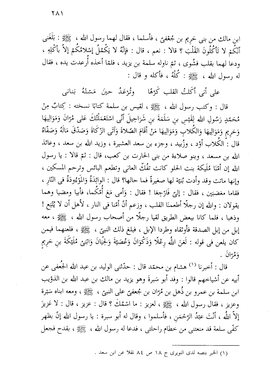 ابن مالك من بنى حَرِيم بن جُعْفىّ، فأسلما، فقال لهما رسول اللَّه، -صلى اللَّه عليه وسلم-: بَلَغَنى أنّكُمْ لا تَأكُلُونَ القَلْبَ؟ قالا: نعم، قال: فإنّهُ لا يَكْمُلُ إسْلامُكُمْ إلّا بأكْلِهِ، ودعا لهما بقلب فشُوى، ثمّ ناوله سلمة بن يزيد، فلمّا أخذه أُرعدت يده، فقال له رسول اللَّه، -صلى اللَّه عليه وسلم-: كُلْهُ، فأكله وقال: