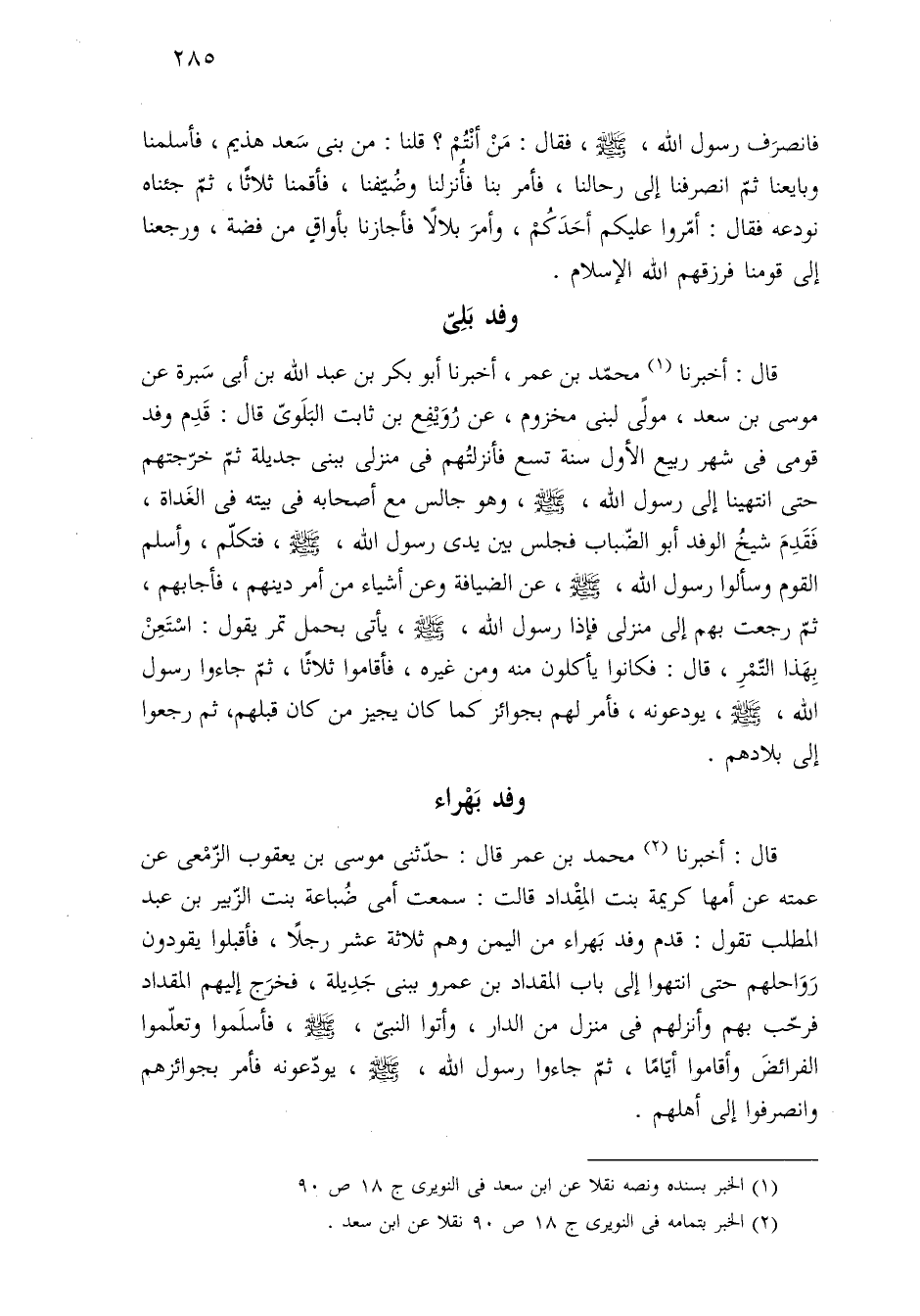 قال: أخبرنا (¬٢) محمد بن عمر قال: حدّثنى موسى بن يعقوب الزّمْعى عن عمته عن أمها كريمة بنت المِقْداد قالت: سمعت أمى ضُباعة بنت الزّبير بن عبد المطلب تقول: قدم وفد بَهراء من اليمن وهم ثلاثة عشر رجلًا، فأقبلوا يقودون رَوَاحلهم حتى انتهوا إلى باب المقداد بن عمرو ببنى جَدِيلة، فخرَج إليهم المقداد فرحّب بهم وأنزلهم فى منزل من الدار، وأتوا النبىّ، -صلى اللَّه عليه وسلم-، فأسلَموا وتعلّموا الفرائضَ وأقاموا أيّامًا، ثمّ جاءوا رسول اللَّه، -صلى اللَّه عليه وسلم-، يودّعونه فأمر بجوائزهم وانصرفوا إلى أهلهم.