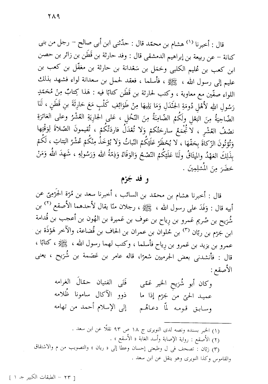 قال: أخبرنا (¬١) هشام بن محمّد قال: حدّثنى ابن أبى صالح -رجل من بنى كنانة- عن ربيعة بن إبراهيم الدمشقى قال: وفد حارثة بن قَطَن بن زائر بن حصن ابن كعب بن عُليم الكلبى وحَمَل بن سَعْدانة بن حارثة بن مغفّل بن كعب بن عليم إلى رسول اللَّه، -صلى اللَّه عليه وسلم-، فأسلما، فعقد لحمل بن سعدانة لواء فشهد بذلك اللواء صفّين مع معاوية، وكتب لحارثة بن قَطَن كتابًا فيه: هَذا كِتابٌ مِنْ مُحَمّدٍ رَسُولِ اللَّه لأهْلِ دُومَةِ الجَنْدَلِ وَمَا يَلِيهَا مِنْ طَوَائِفِ كَلْبٍ مَعَ حَارِثَةَ بنِ قَطَنٍ، لَنَا الضّاحِيَةُ مِنَ البَعْلِ ولَكُمُ الضّامِنَةُ مِنَ النّخْلِ، عَلى الجارِيَةِ العُشْرُ وعلى الغائرَةِ نصْفُ العُشْرِ، لا تُجْمَعُ سارحَتُكمْ وَلا تُعْدَلُ فاردَتُكُمْ، تُقيمونَ الصّلاةَ لِوَقْتِها وَتُؤتُونَ الزّكاةَ بِحَقّهَا، لا يُحْظَرُ عَلَيْكُمُ النّباتُ وَلا يُؤخَذُ مِنْكُمْ عُشْرُ البَتاتِ، لَكُمْ بِذَلِكَ العَهْدُ والميثَاقُ ولَنَا عَلَيْكُمُ النّصْحُ وَالوَفَاءُ وَذِمّةُ اللَّه وَرَسُولِهِ، شَهِدَ اللَّه وَمَنْ حَضَرَ مِنَ المُسْلِمِينَ.