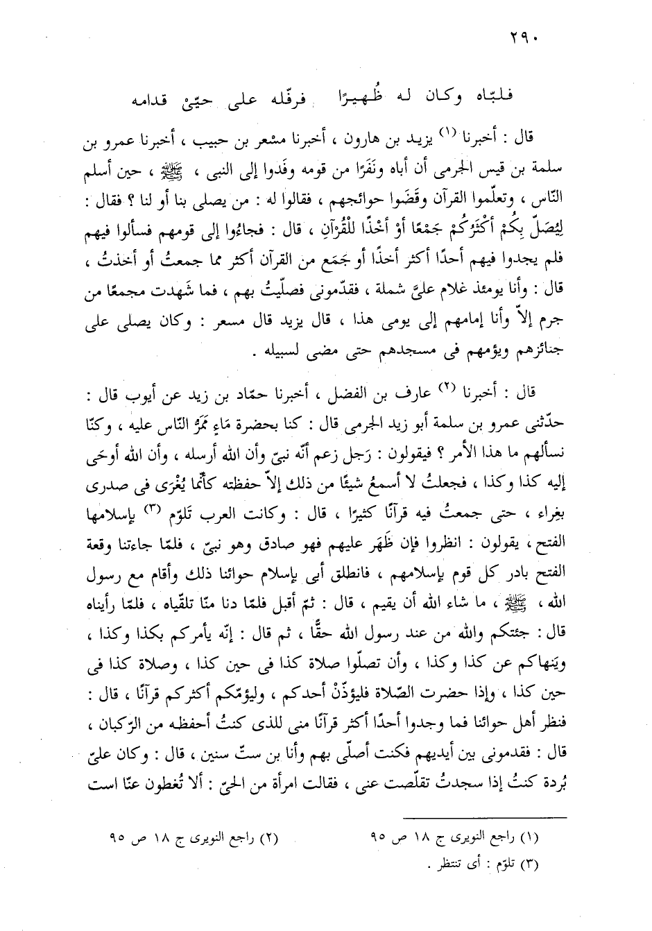 قال: أخبرنا (¬٢) عارف بن الفضل، أخبرنا حمّاد بن زيد عن أيوب قال: حدّثنى عمرو بن سلمة أبو زيد الجرمى قال: كنا بحضرة مَاءٍ مَمَرُّ النّاس عليه، وكنّا نسألهم ما هذا الأمر؟ فيقولون: رَجل زعم أنّه نبىّ وأن اللَّه أرسله، وأن اللَّه أوحَى إليه كذا وكذا، فجعلتُ لا أسمعُ شيئًا من ذلك إلّا حفظته كأنّما يُغْرَى فى صدرى بغِراء، حتى جمعتُ فيه قرآنًا كثيرًا، قال: وكانت العرب تَلوّم (¬٣) بإسلامها الفتح، يقولون: انظروا فإن ظَهَر عليهم فهو صادق وهو نبىّ، فلمّا جاءتنا وقعة الفتح بادر كل قوم بإسلامهم، فانطلق أبى بإسلام حوائنا ذلك وأقام مع رسول اللَّه، -صلى اللَّه عليه وسلم-، ما شاء اللَّه أن يقيم، قال: ثمّ أقبل فلمّا دنا منّا تلقّياه، فلمّا رأيناه قال: جئتكم واللَّه من عند رسول اللَّه حقًّا، ثم قال: إنّه يأمركم بكذا وكذا، ويَنهاكم عن كذا وكذا، وأن تصلّوا صلاة كذا فى حين كذا، وصلاة كذا فى حين كذا، وإذا حضرت الصّلاة فليؤذّنْ أحدكم، وليؤمّكم أكثركم قرآنًا، قال: فنظر أهل حوائنا فما وجدوا أحدًا أكثر قرآنًا منى للذى كنتُ أحفظه من الرّكبان، قال: فقدمونى بين أيديهم فكنت أصلّى بهم وأنا بن ستّ سنين، قال: وكان علىّ بُردة كنتُ إذا سجدتُ تقلّصت عنى، فقالت امرأة من الحىّ: ألا تُغطون عنّا است