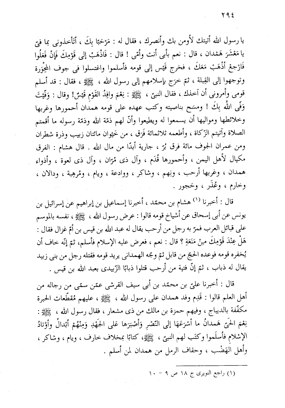 قال: أخبرنا علىّ بن محمّد بن أبى سيف القرشى عمّن سمّى من رجاله من أهل العلم قالوا: قَدِم وفد همدان على رسول اللَّه، -صلى اللَّه عليه وسلم-، عليهم مُقطّعات الحبرة مكفّفة بالديباج، وفيهم حمزة بن مالك من ذى مشعار، فقال رسول اللَّه، -صلى اللَّه عليه وسلم-: نِعْمَ الحَىّ هَمدانُ ما أسْرَعَهَا إلى النّصْرِ وَأصْبَرَها عَلى الجَهْدِ وَمِنْهُمْ أبْدالُ وأوْتادُ الإسْلامِ فأسلَموا وكتَب لهم النبىّ، -صلى اللَّه عليه وسلم-، كتابًا بمخلاف خارف، ويام، وشاكر، وأهل الهَضْب، وحقاف الرمل من همدان لمن أسلم.