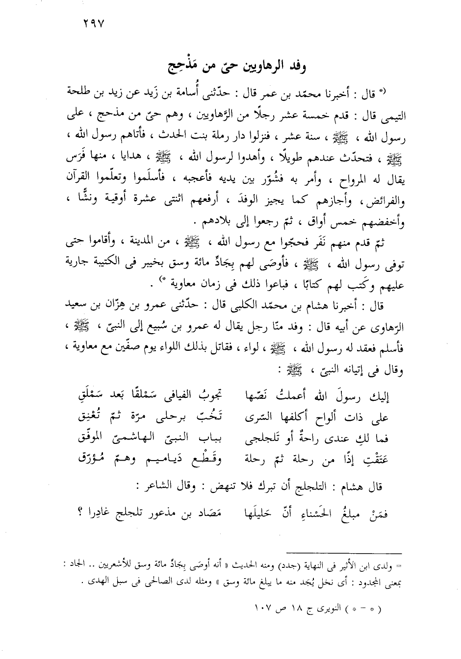 (* قال: أخبرنا محمّد بن عمر قال: حدّثنى أُسامة بن زَيد عن زيد بن طلحة التيمى قال: قدم خمسة عشر رجلًا من الرَّهاويين، وهم حىّ من مذحج، على رسول اللَّه، -صلى اللَّه عليه وسلم-، سنة عشر، فنزلوا دار رملة بنت الحدث، فأتاهم رسول اللَّه، -صلى اللَّه عليه وسلم-، فتحدّث عندهم طويلًا، وأهدوا لرسول اللَّه، -صلى اللَّه عليه وسلم-، هدايا، منها فَرَس يقال له المرواح، وأمر به فشُوّر بين يديه فأعجبه، فأسلَموا وتعلّموا القرآن والفرائض، وأجازهم كما يجيز الوفدَ، أرفعهم اثنتى عشرة أوقية ونشًّا، وأخفضهم خمس أواق، ثمّ رجعوا إلى بلادهم.