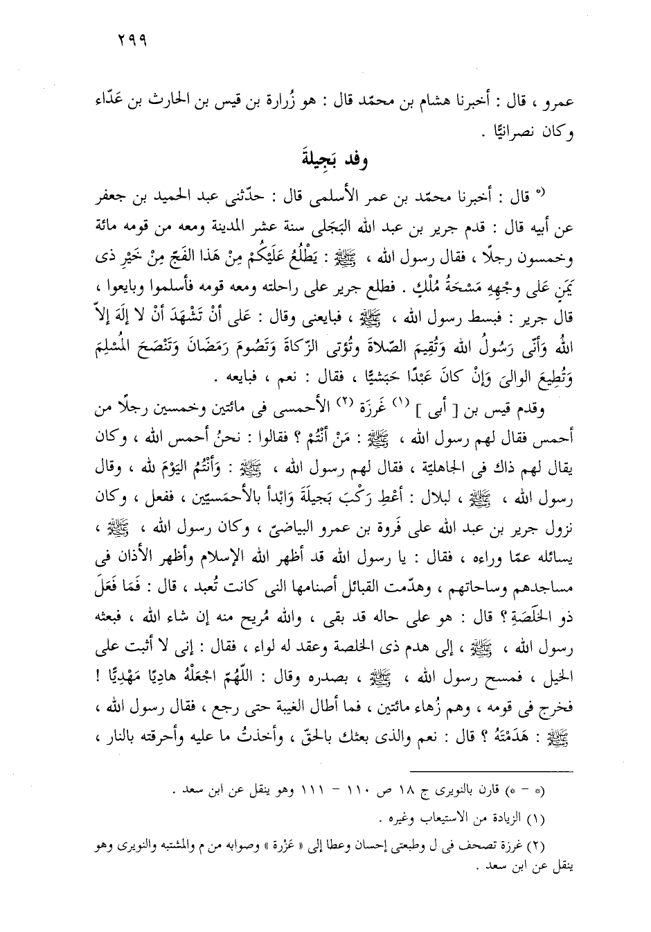 (* قال: أخبرنا محمد بن عمر الأسلمى قال: حدّثنى عبد الحميد بن جعفر عن أبيه قال: قدم جرير بن عبد اللَّه البَجَلى سنة عشر المدينة ومعه من قومه مائة وخمسون رجلًا، فقال رسول اللَّه، -صلى اللَّه عليه وسلم-: يَطْلُعُ عَلَيْكُمْ مِنْ هَذا الفَجّ مِنْ خَيْرِ ذى يَمَنٍ عَلى وجْهِهِ مَسْحَةُ مُلْكٍ. فطلع جرير على راحلته ومعه قومه فأسلموا وبايعوا، قال جرير: فبسط رسول اللَّه، -صلى اللَّه عليه وسلم-، فبايعنى وقال: عَلى أنْ تَشْهَدَ أنْ لا إلَهَ إلّا اللَّه وَأنّى رَسُولُ اللَّه وَتُقِيمَ الصّلاةَ وتُؤتى الزّكاةَ وَتَصُومَ رَمَضَانَ وَتَنْصَحَ المُسْلِمَ وَتُطِيعَ الوالىَ وَإنْ كانَ عَبْدًا حَبَشيًّا، فقال: نعم، فبايعه.