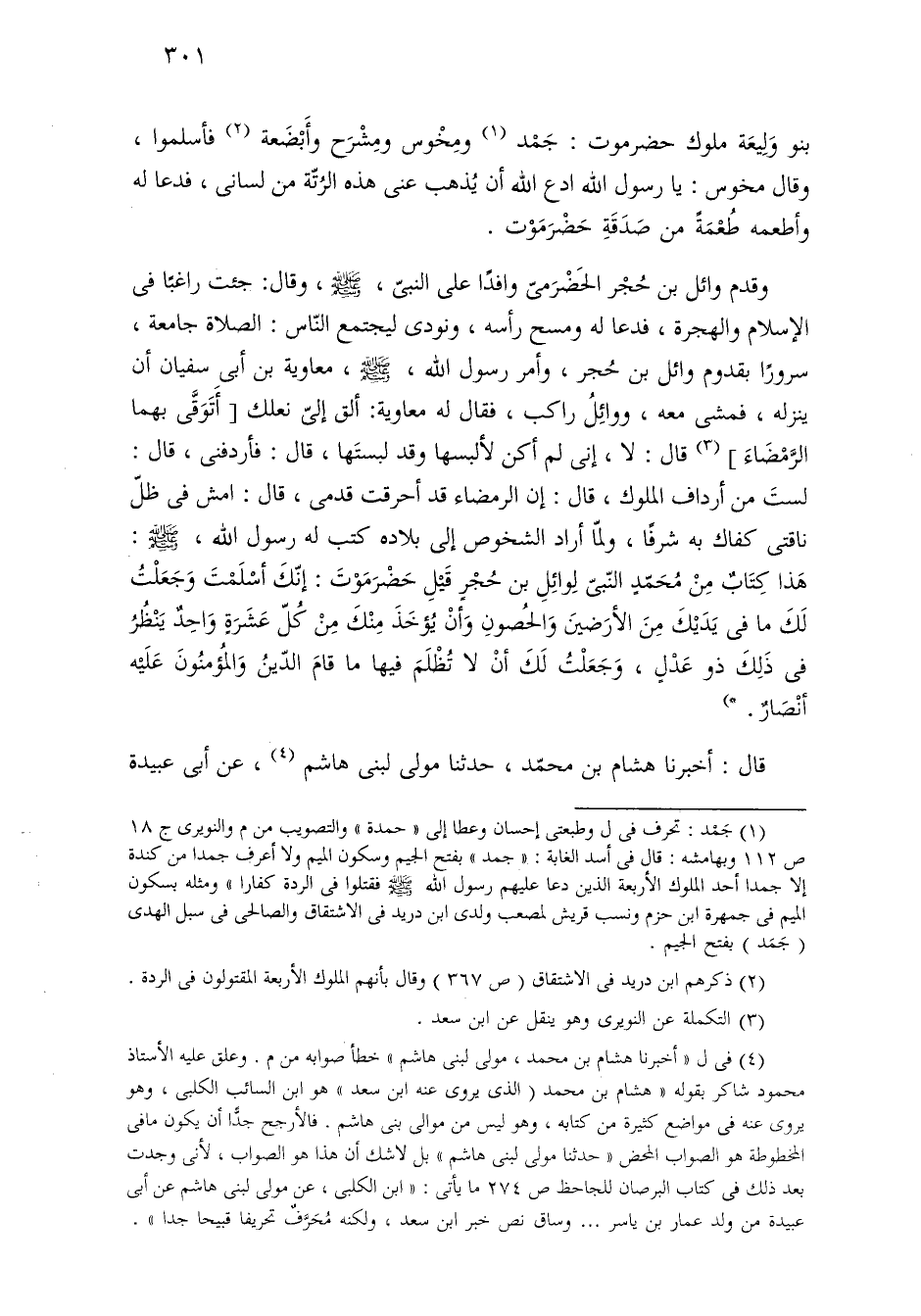 وقدم وائل بن حُجْر الحَضْرَمىّ وافدًا على النبىّ، -صلى اللَّه عليه وسلم-، وقال: جئت راغبًا فى الإسلام والهجرة، فدعا له ومسح رأسه، ونودى ليجتمع النّاس: الصلاة جامعة، سرورًا بقدوم وائل بن حُجر، وأمر رسول اللَّه، -صلى اللَّه عليه وسلم-، معاوية بن أبى سفيان أن ينزله، فمشى معه، ووائِلُ راكب، فقال له معاوية: ألق إلىّ نعلك [أَتَوَقَّى بهما الرَّمْضَاءَ] (¬٣) قال: لا، إنى لم أكن لألبسها وقد لبستَها، قال: فأردفنى، قال: لستَ من أرداف الملوك، قال: إن الرمضاء قد أحرقت قدمى، قال: امش فى ظلّ ناقتى كفاك به شرفًا، ولمّا أراد الشخوص إلى بلاده كتب له رسول اللَّه، -صلى اللَّه عليه وسلم-: هَذا كِتَابٌ مِنْ مُحَمّدٍ النّبىّ لِوائِلِ بن حُجْرٍ قَيْلِ حَضْرَمَوْتَ: إنّكَ أسْلَمْتَ وَجَعَلْتُ لَكَ ما فى يَدَيْكَ مِنَ الأرَضينَ وَالحُصونِ وَأنْ يُؤخَذَ مِنْكَ مِنْ كُلّ عَشَرَةٍ وَاحِدٌ يَنْظُرُ فى ذَلِكَ ذو عَدْلٍ، وَجَعَلْتُ لَكَ أنْ لا تُظْلَمَ فيها ما قامَ الدّينُ وَالمُؤمنُونَ عَلَيْه أنْصَارٌ. *)
