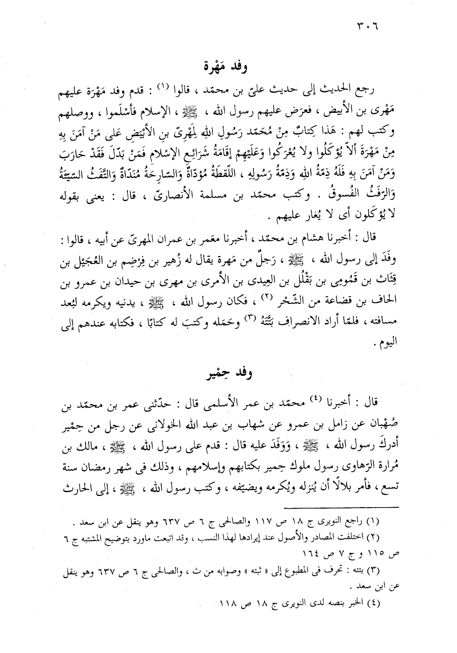 رجع الحديث إلى حديث علىّ بن محمّد، قالوا (¬١): قدم وفد مَهْرَة عليهم مَهْرى بن الأبيض، فعرَض عليهم رسول اللَّه، -صلى اللَّه عليه وسلم-، الإسلام فأسْلموا، ووصلهم وكتب لهم: هَذا كِتابٌ مِنْ مُحَمّد رَسُولِ اللَّه لِمَهْرِىّ بن الأبْيَضِ عَلى مَنْ آمَنَ بِهِ مِنْ مَهْرَةَ ألّا يُؤكَلُوا ولا يُعْرَكُوا وَعَلَيْهِمْ إقَامَةُ شَرَائِعِ الإِسْلام فَمَنْ بَدّلَ فَقَدْ حَارَبَ وَمَنْ آمَنَ بِهِ فَلَهُ ذَمّةُ اللَّه وَذِمّةُ رَسُولِهِ، اللّقطَةُ مُؤدّاةٌ وَالسّارِحَةُ مُنَدّاةٌ وَالتَّفَثُ السّيّئَةُ وَالرّفَثُ الفُسوقُ. وكتب محمّد بن مسلمة الأنصارىّ، قال: يعنى بقوله لا يُؤكَلون أى لا يُغار عليهم.