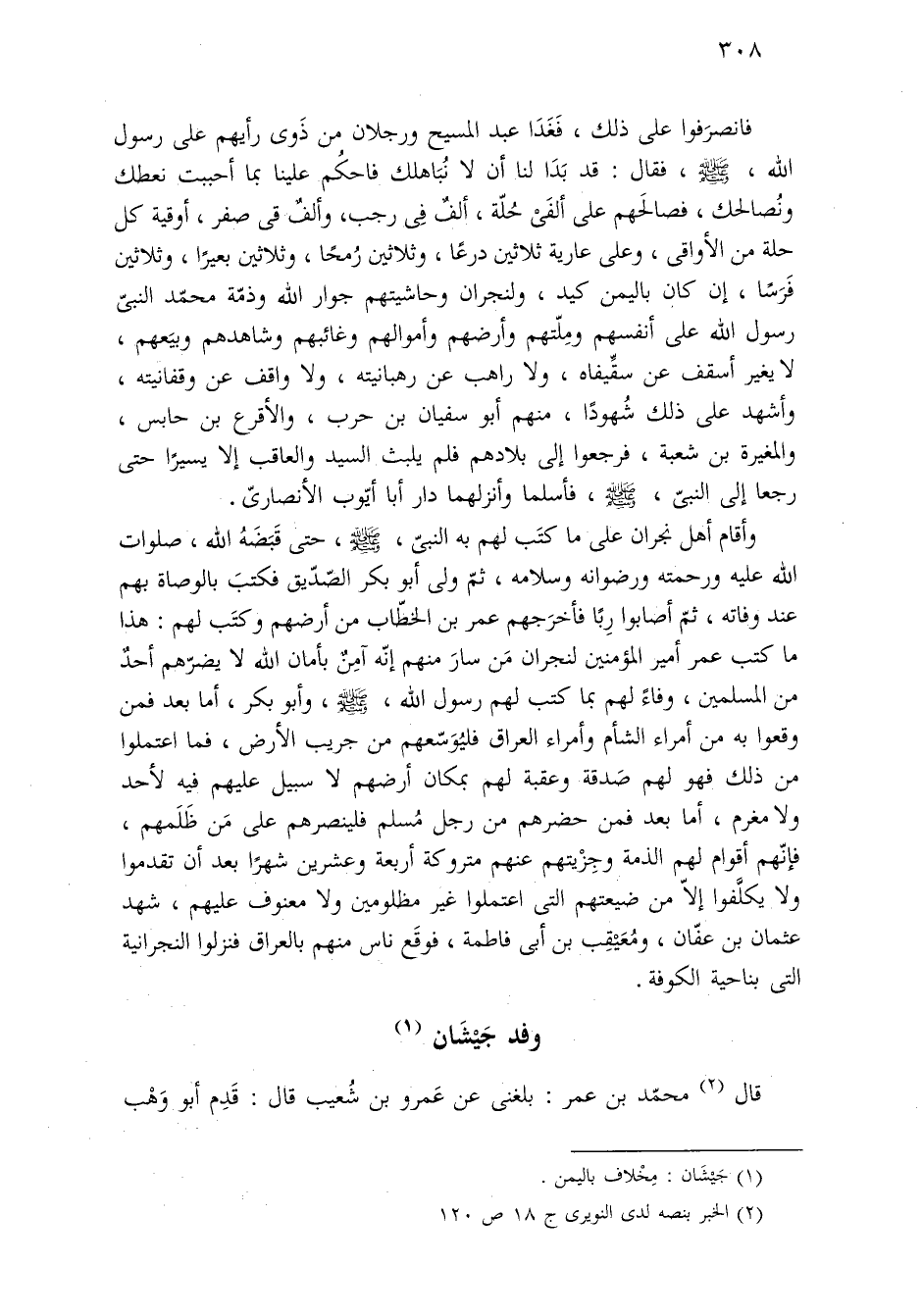 وأقام أهل نجران على ما كتَب لهم به النبىّ، -صلى اللَّه عليه وسلم-، حتى قَبَضَهُ اللَّه، صلوات اللَّه عليه ورحمته ورضوانه وسلامه، ثمّ ولى أبو بكر الصّدّيق فكتبَ بالوصاة بهم عند وفاته، ثمّ أصابوا رِبًا فأخرَجهم عمر بن الخطّاب من أرضهم وكتَب لهم: هذا ما كتب عمر أميرِ المؤمنين لنجران مَن سارَ منهم إنّه آمِنٌ بأمان اللَّه لا يضرّهم أحدٌ من المسلمين، وفاءً لهم بما كتب لهم رسول اللَّه، -صلى اللَّه عليه وسلم-، وأبو بكر، أما بعد فمن وقعوا به من أمراء الشأم وأمراء العراق فليُوَسّعهم من جريب الأرض، فما اعتملوا من ذلك فهو لهم صَدقة وعقبة لهم بمكان أرضهم لا سبيل عليهم فيه لأحد ولا مغرم، أما بعد فمن حضرهم من رجل مُسلم فلينصرهم على مَن ظَلَمهم، فإنّهم أقوام لهم الذمة وجِزْيتهم عنهم متروكة أربعة وعشرين شهرًا بعد أن تقدموا ولا يكلَّفوا إلّا من ضيعتهم التى اعتملوا غير مظلومين ولا معنوف عليهم، شهد عثمان بن عفّان، ومُعَيْقِب بن أبى فاطمة، فوقَع ناس منهم بالعراق فنزلوا النجرانية التى بناحية الكوفة.